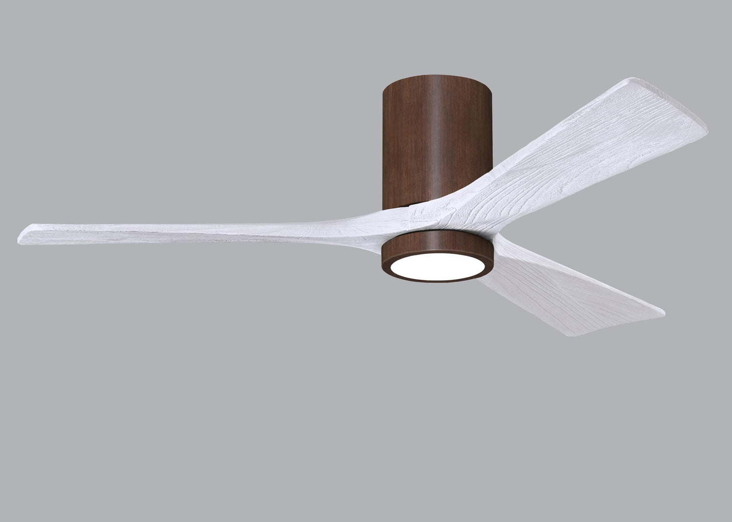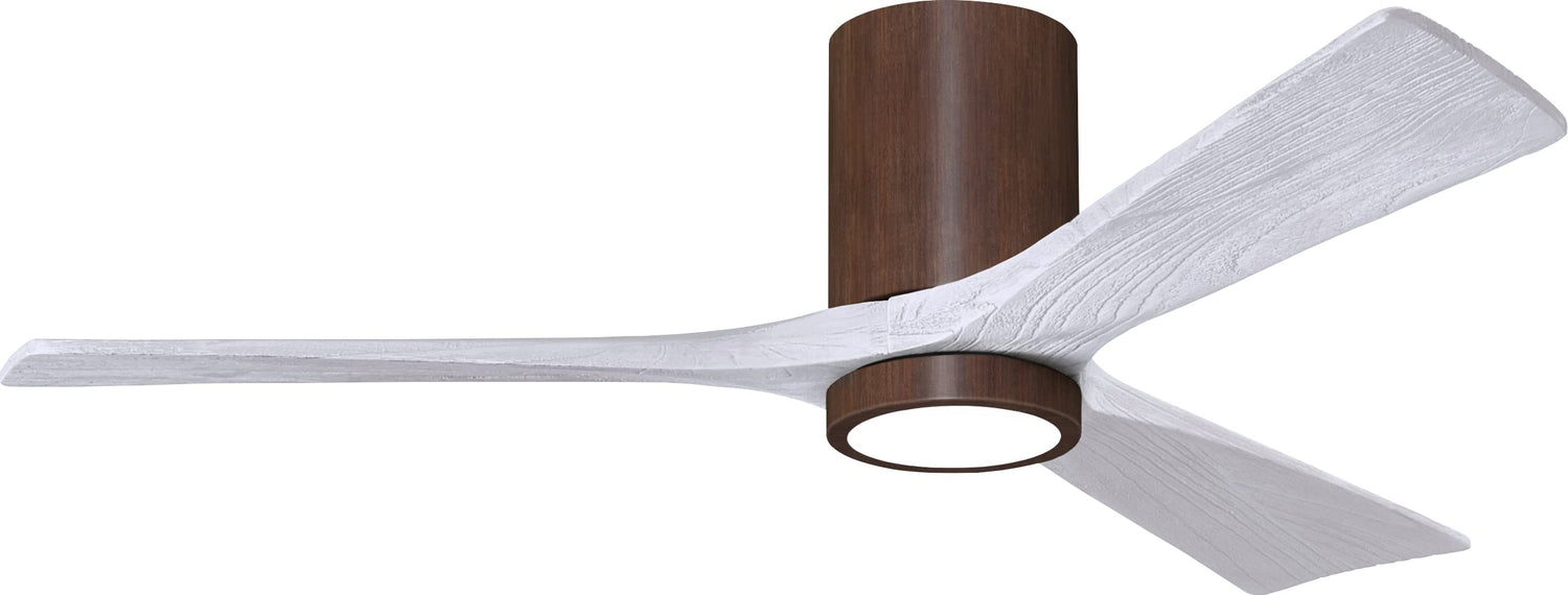 Matthews Fan IR3HLK-WN-MWH-52 Irene-3HLK three-blade flush mount paddle fan in Walnut finish with 52” solid matte white wood blades and integrated LED light kit.