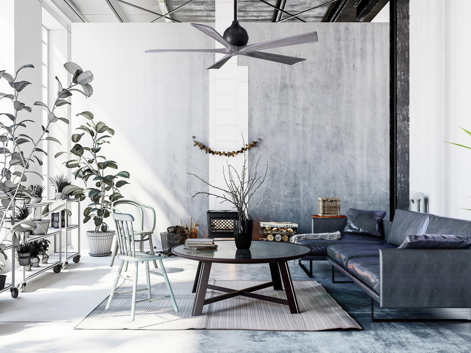 The Irene–5 is rustic, yet strikingly modern with three neatly joined, solid matte black, gray ash, light maple matte white, walnut, or barn wood tone blades. A spherical motor housing complements its minimal profile. Irene–3 is streamline while still appearing warm and natural. Constructed of cast aluminum and heavy stamped steel, the Irene–3 has a limited lifetime warranty.