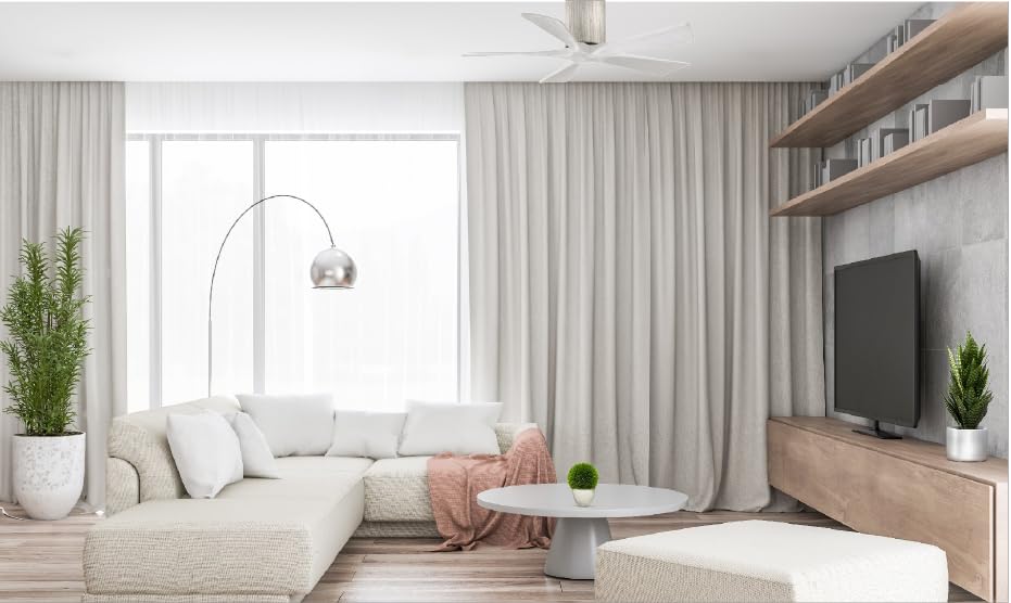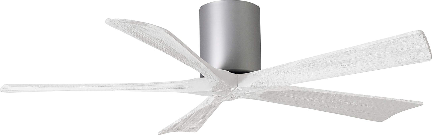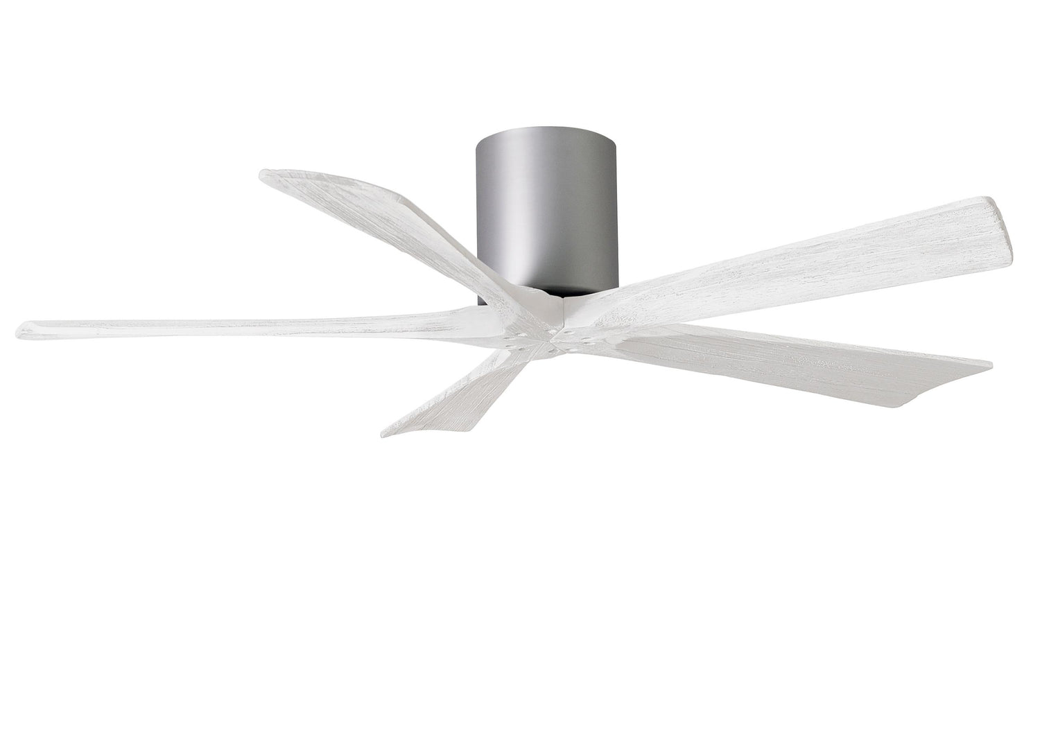 Matthews Fan IR5H-BN-MWH-52 Irene-5H five-blade flush mount paddle fan in Brushed Nickel finish with 52” solid matte white wood blades.