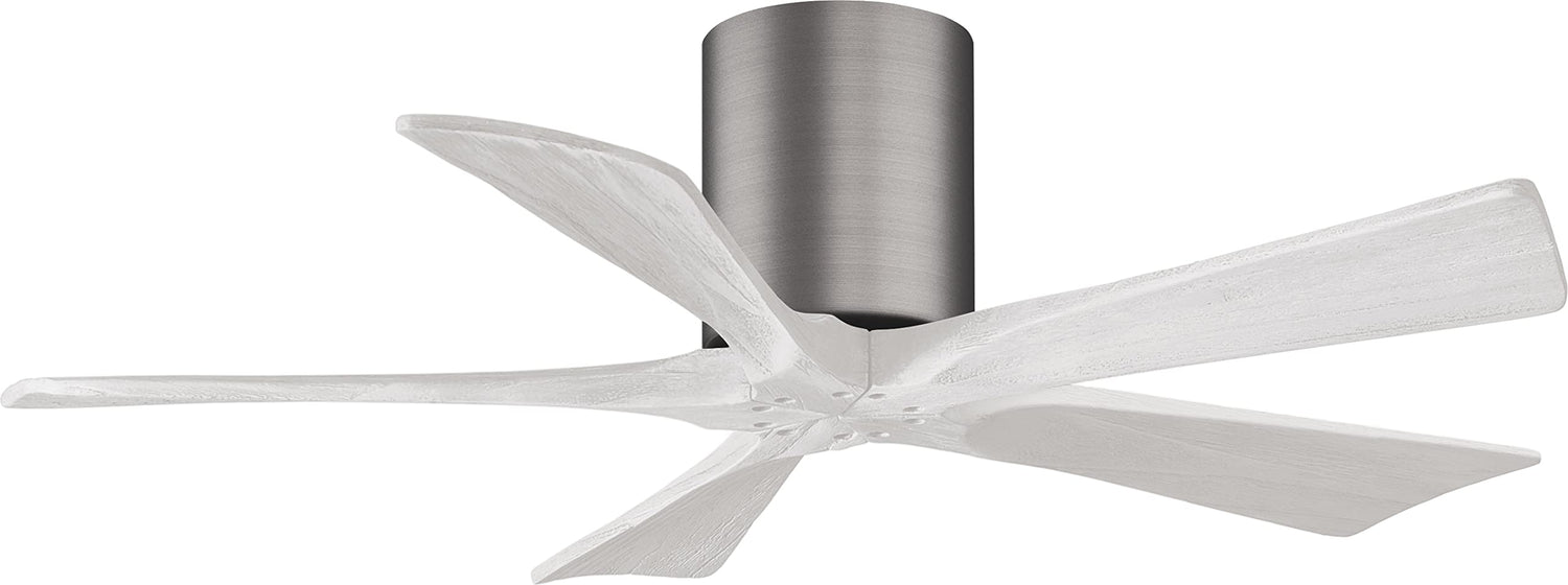 Matthews Fan IR5H-BP-MWH-42 Irene-5H five-blade flush mount paddle fan in Brushed Pewter finish with 42” solid matte white wood blades.