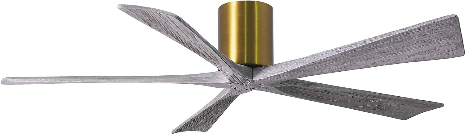 Matthews Fan IR5H-BRBR-BW-60 Irene-5H five-blade flush mount paddle fan in Brushed Brass finish with 60” solid barn wood tone blades.