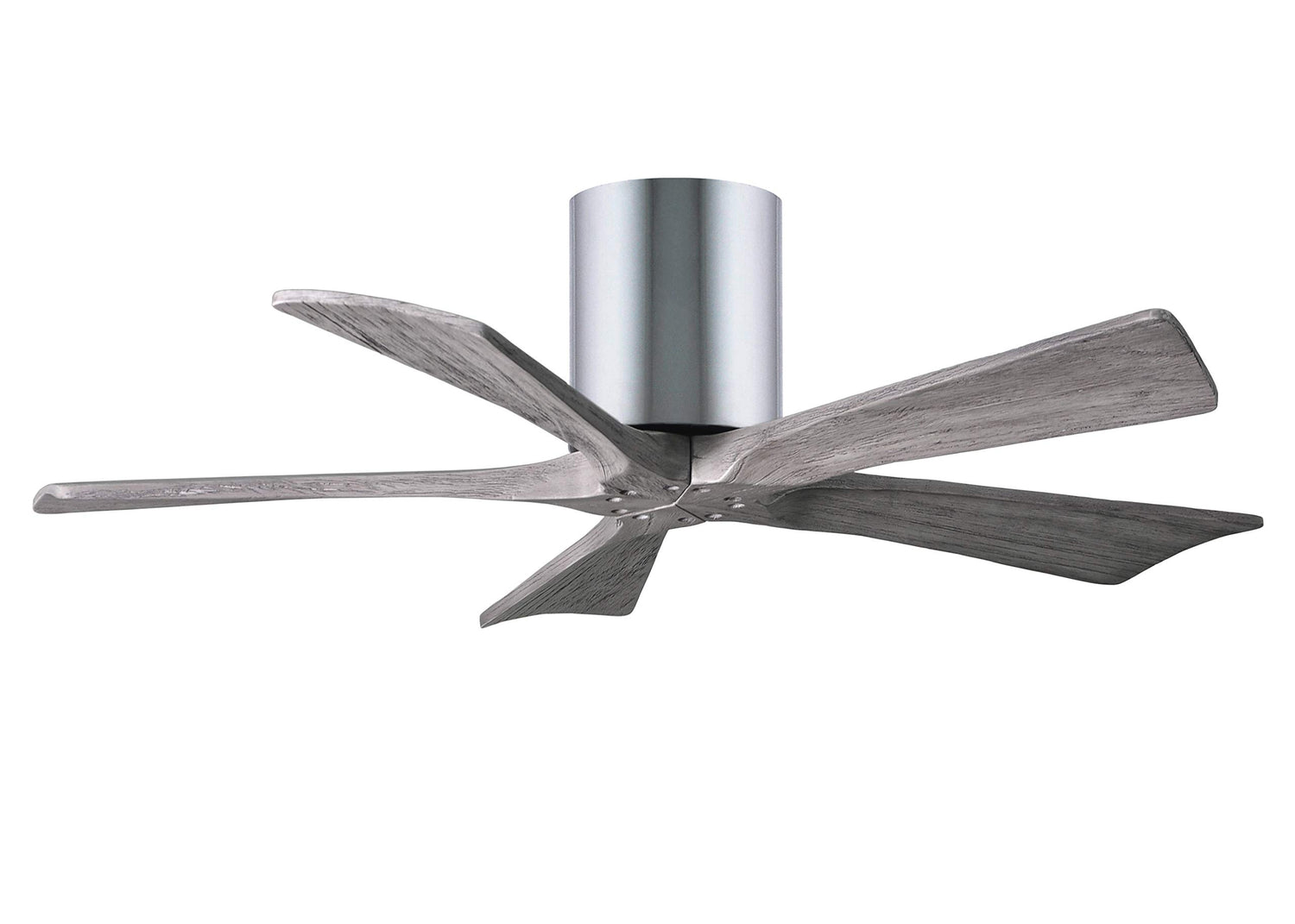 Matthews Fan IR5H-CR-BW-42 Irene-5H five-blade flush mount paddle fan in Polished Chrome finish with 42” solid barn wood tone blades.
