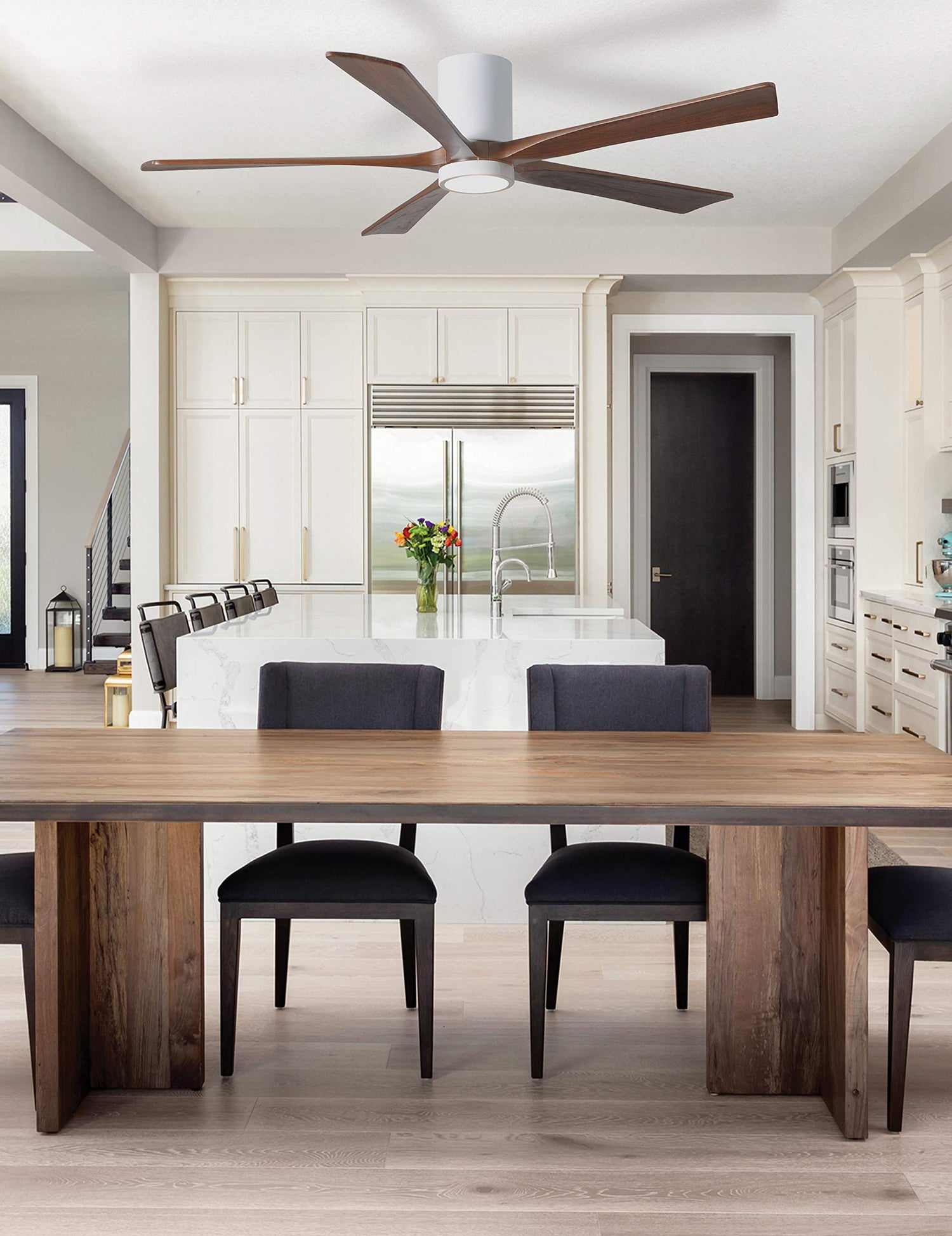 The Irene–5HLK ceiling-mount fan is rustic, yet strikingly modern with five neatly joined, solid wood matte black, matte white, walnut, or barn wood tone blades. A cylindrical motor housing complements its minimal profile. Irene–5HLK is streamline while still appearing warm and natural. Constructed of cast aluminum and heavy stamped steel, the Irene–5HLK has a limited lifetime warranty.