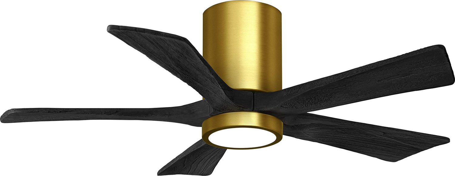 Matthews Fan IR5HLK-BRBR-BK-42 IR5HLK five-blade flush mount paddle fan in Brushed Brass finish with 42” solid barn wood tone blades and integrated LED light kit.