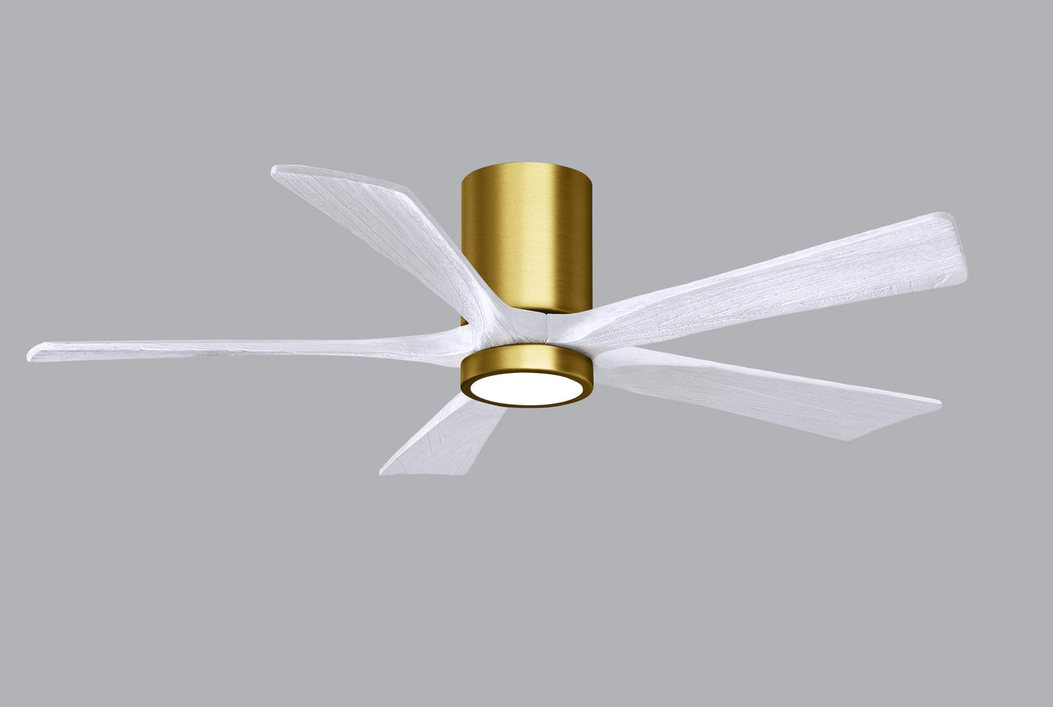 Matthews Fan IR5HLK-BRBR-MWH-52 IR5HLK five-blade flush mount paddle fan in Brushed Brass finish with 52” solid matte black wood blades and integrated LED light kit.