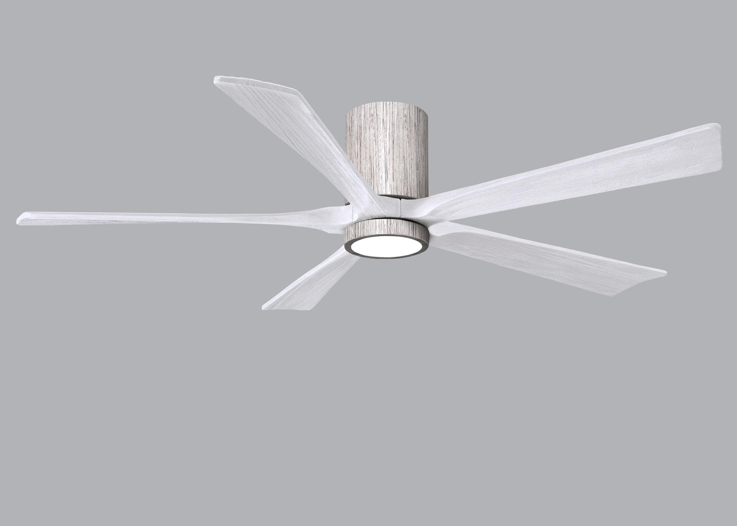 Matthews Fan IR5HLK-BW-MWH-60 IR5HLK five-blade flush mount paddle fan in Barn Wood finish with 60” solid matte white wood blades and integrated LED light kit.
