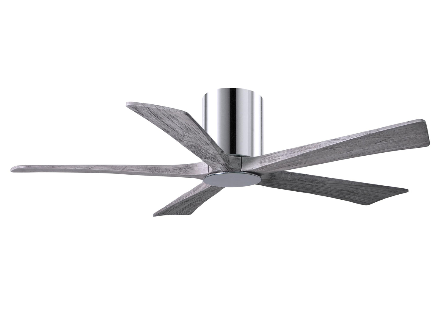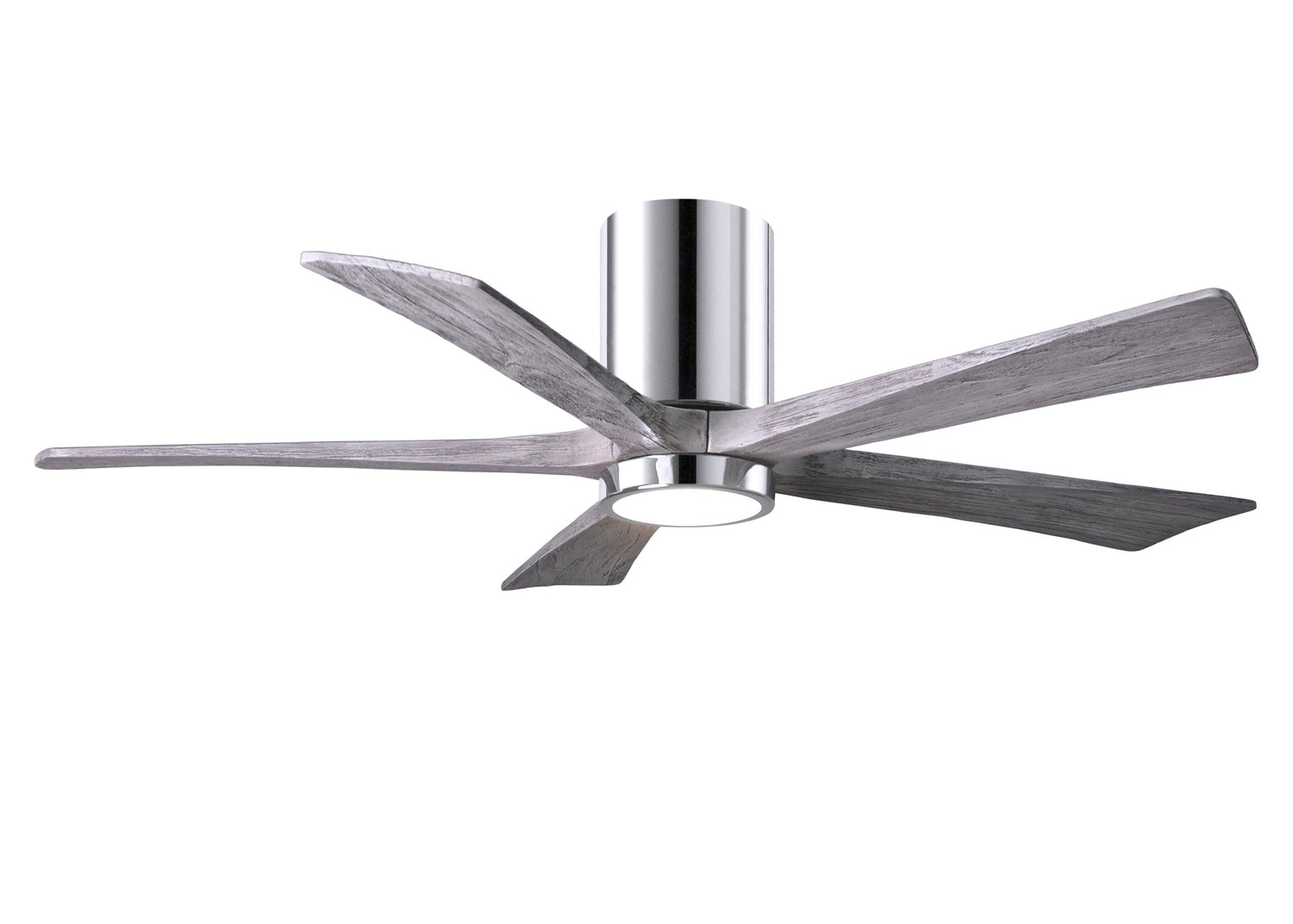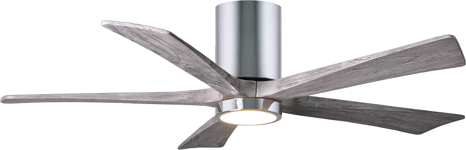 Matthews Fan IR5HLK-CR-BW-52 IR5HLK five-blade flush mount paddle fan in Polished Chrome finish with 52” solid barn wood tone blades and integrated LED light kit.