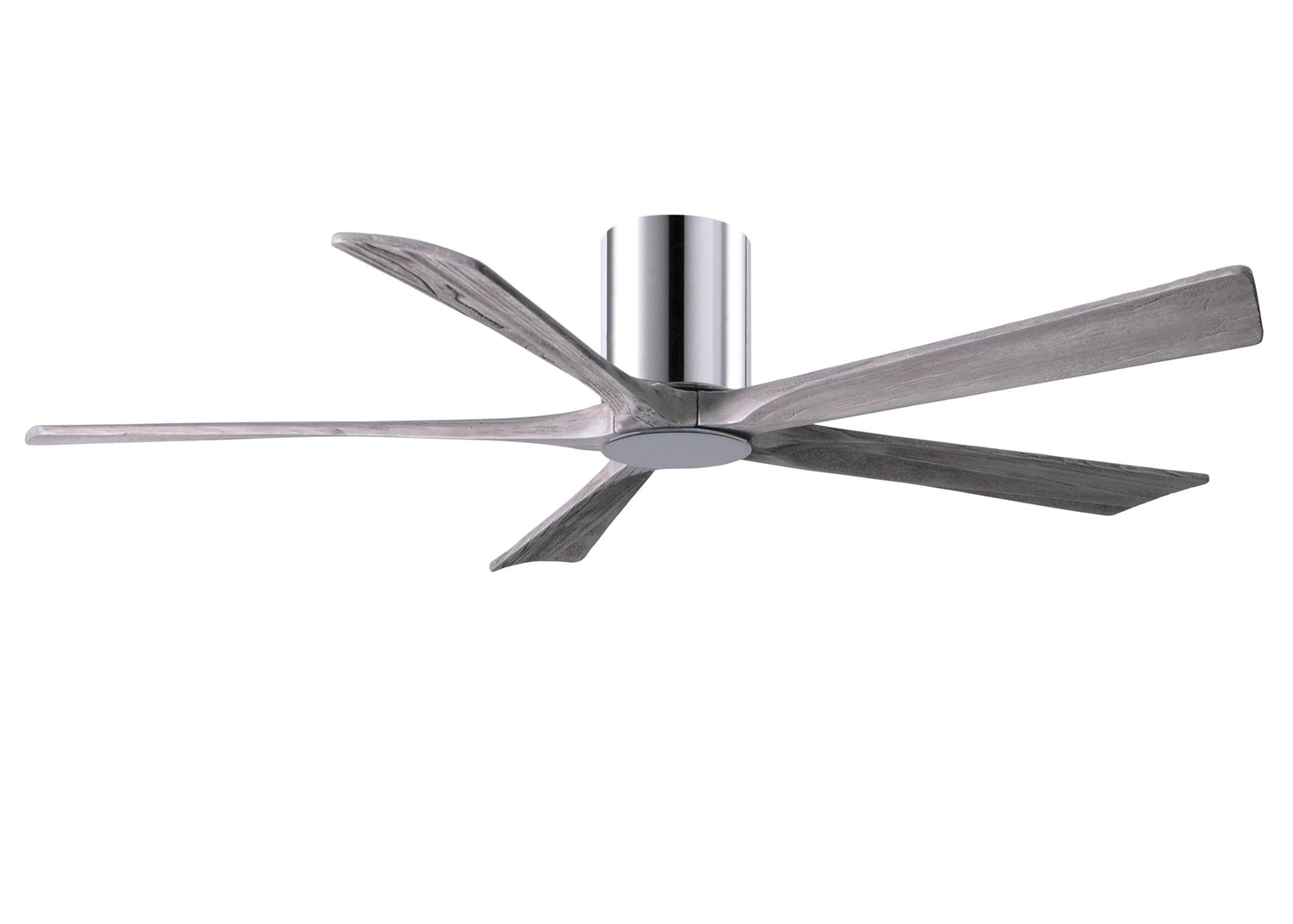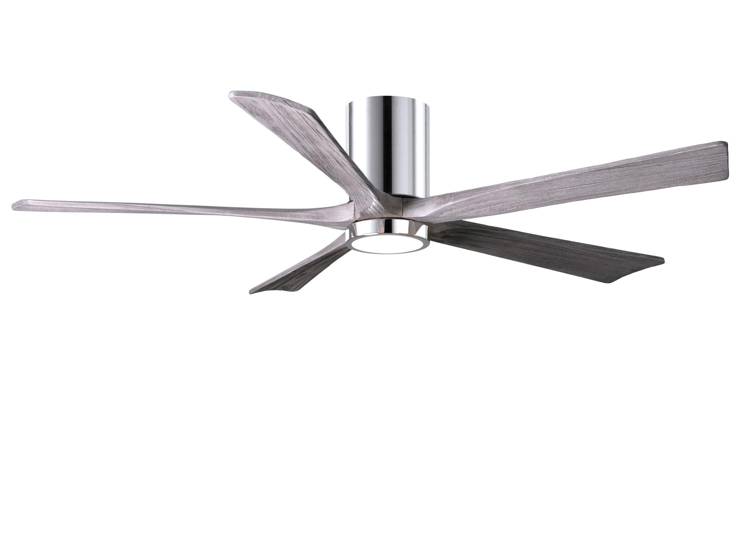 Matthews Fan IR5HLK-CR-BW-60 IR5HLK five-blade flush mount paddle fan in Polished Chrome finish with 60” solid barn wood tone blades and integrated LED light kit.