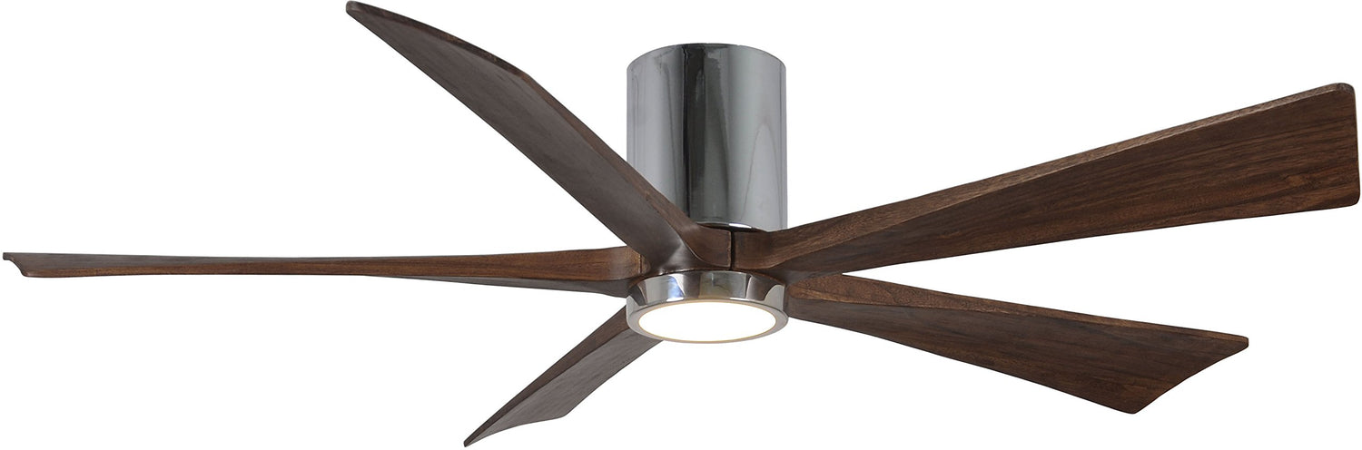 Matthews Fan IR5HLK-CR-WA-60 IR5HLK five-blade flush mount paddle fan in Polished Chrome finish with 60” solid walnut tone blades and integrated LED light kit.