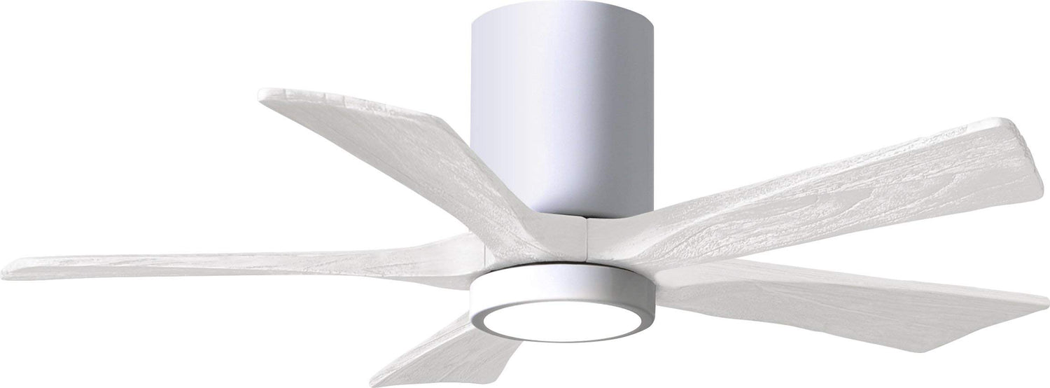 Matthews Fan IR5HLK-WH-MWH-42 IR5HLK five-blade flush mount paddle fan in Gloss White finish with 42” solid matte white wood blades and integrated LED light kit.