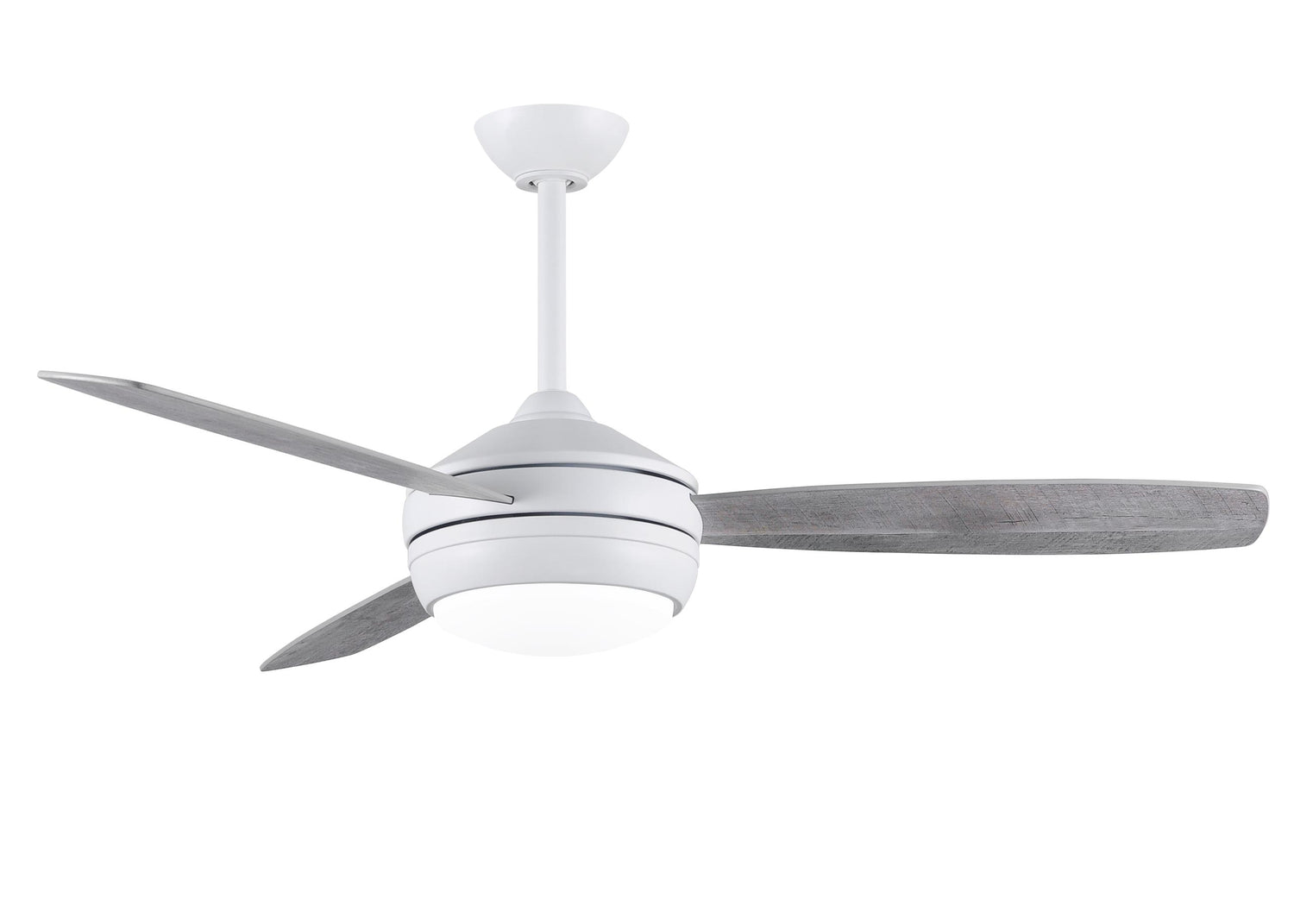 T-24 efficient 4-speed ceiling fan in Matte White finish with reversible 52" Maple/Barn Wood blades and LED light kit.
