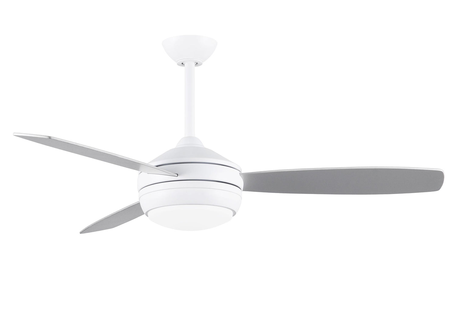 T-24 efficient 4-speed ceiling fan in Matte White finish with reversible 52" Matte White/Brushed Nickel blades and LED light kit.