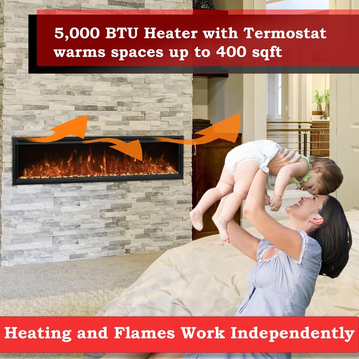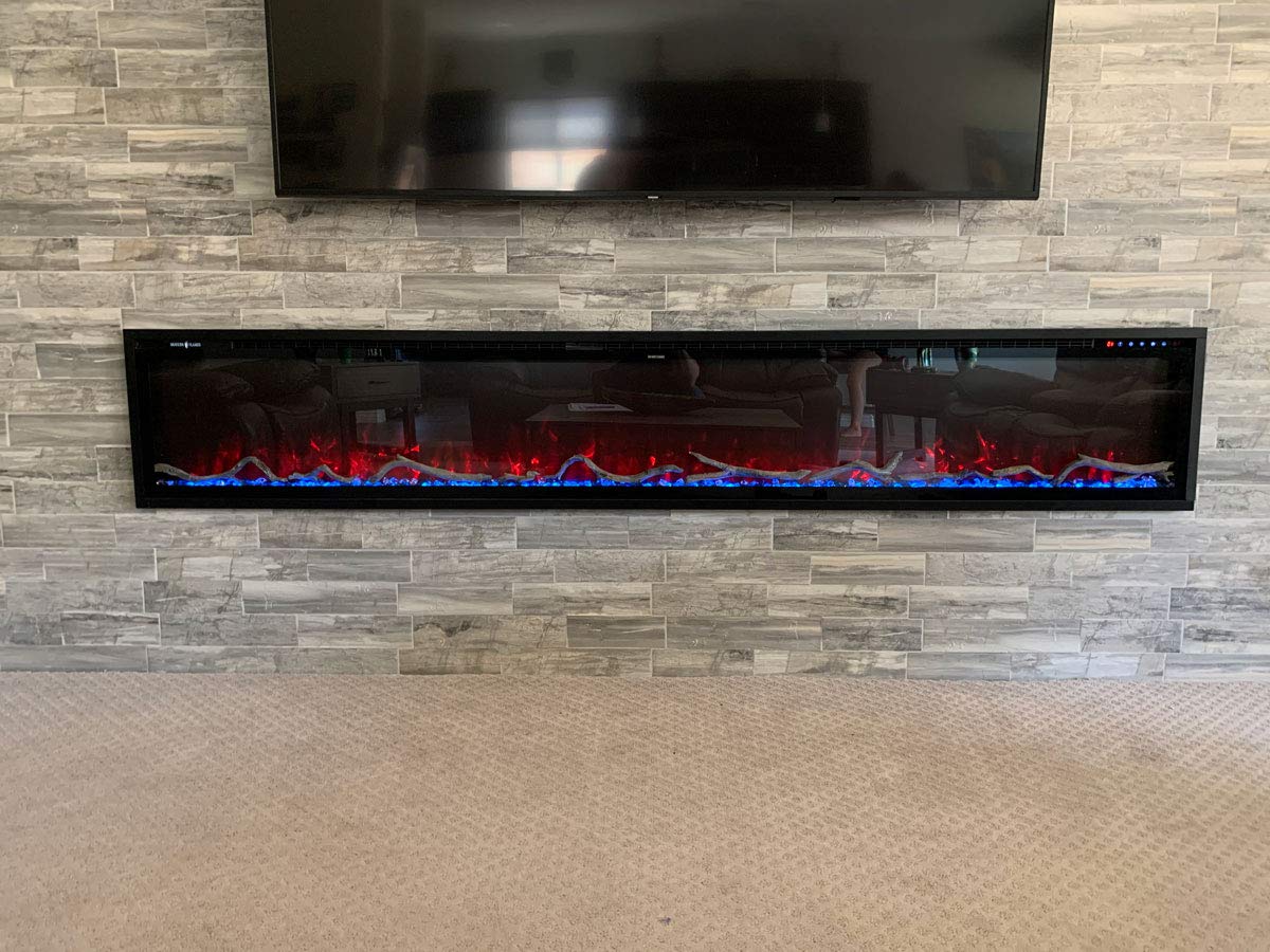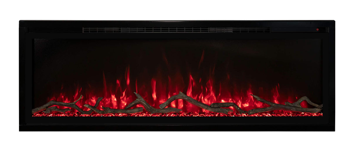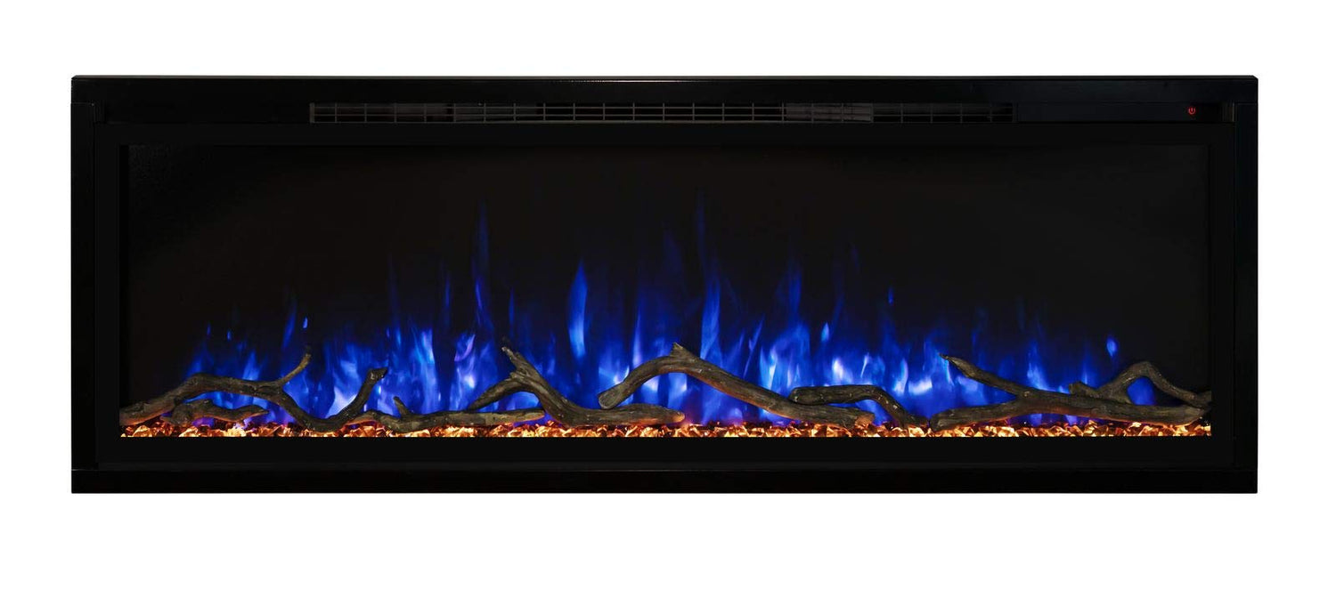 The Modern Flames Spectrum Series Slimline Wall Mount/Built-In Electric Fireplace provides the perfect fireplace option for anyone looking for a unique fire feature. The Spectrum Series Slimline electric fireplace can transform the look of any room with its minimal design and thin trim designed to maximize viewing area. This design also allows hardwood or tile to be installed right up to the opening of the fireplace while still maintaining serviceability. Hybrid-FX flame technology, independent flame control, and 10 LED flame and ember bed color options create a lively fire presentation, while driftwood logs and acrylic media further enhance the firebox appearance. An included full-featured remote makes operation simple, while an integrated 5,000 BTU heater offers cozy zone heating for even more enjoyment.