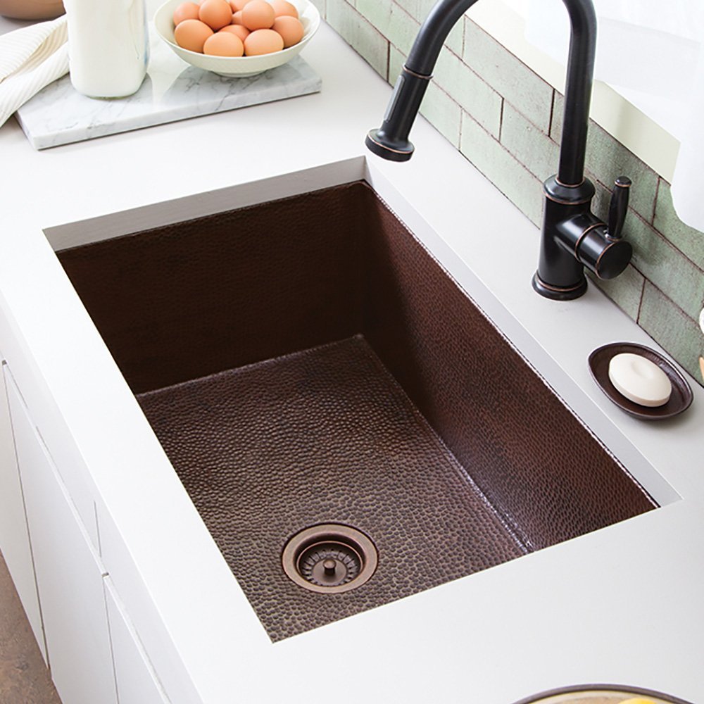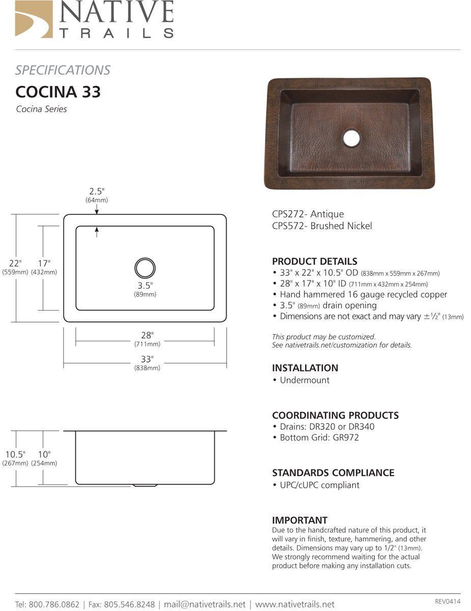 CPS272 Finish: Antique Copper Features: -16 gauge hammered copper. -IAPMO listed and cUPC certified. -Can be installed as a drop-in or undermount. Installation Type: -Undermount/Drop-In. Material: -Copper. Sink Shape: -Rectangular. Number of Faucet Holes: -0. Number of Basins: -1. Dimensions: -Drain Opening Diameter: 3.5". Overall Sink Depth - Top to Bottom: -10.5". Overall Length - Side to Side: -33". Overall Width - Front to Back: -22". Overall Product Weight: -43 lbs.