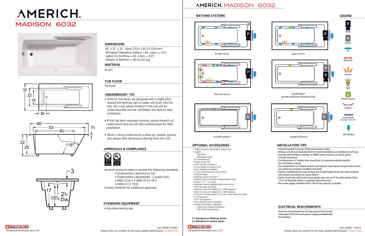 Americh MA6032TA5-BI Madison 6032 - Tub Only / Airbath 5 - Biscuit