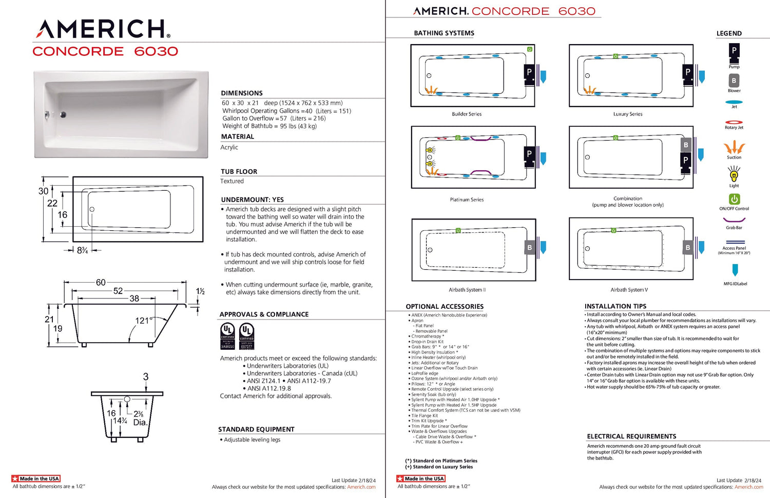 Americh CN6030TA5-BI Concorde 6030 - Tub Only / Airbath 5 - Biscuit