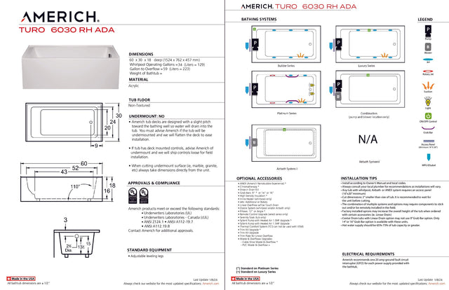 Americh TO6030ADATRA5WH Turo 6030 ADA Right Hand - Tub Only / Airbath 5 - White