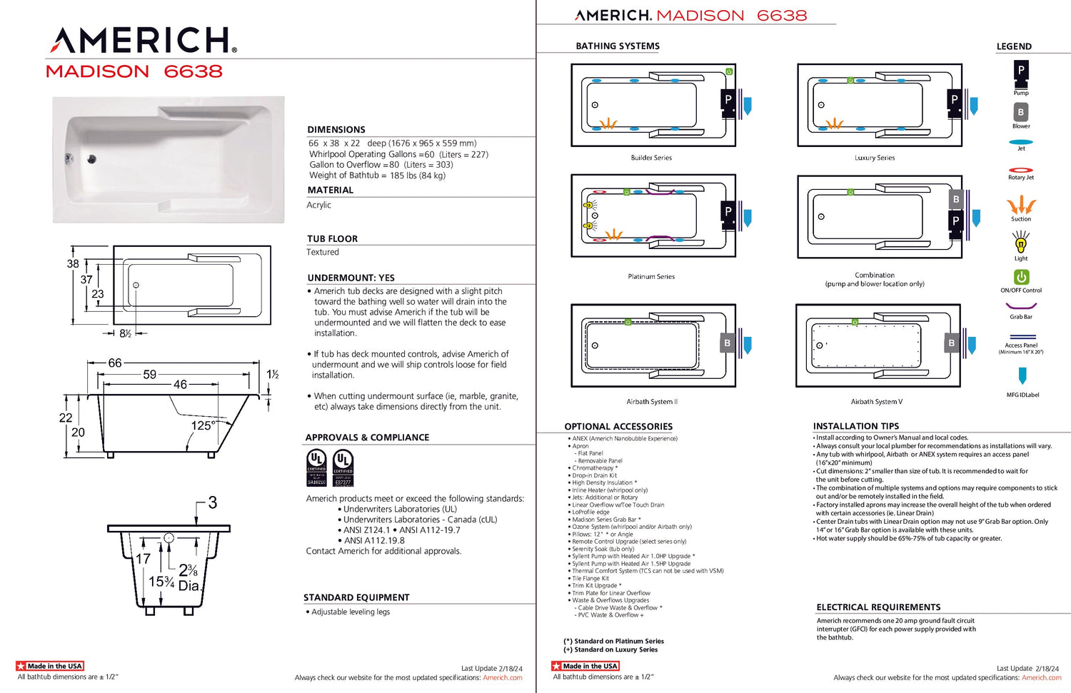 Americh MA6638TA5-BI Madison 6638 - Tub Only / Airbath 5 - Biscuit