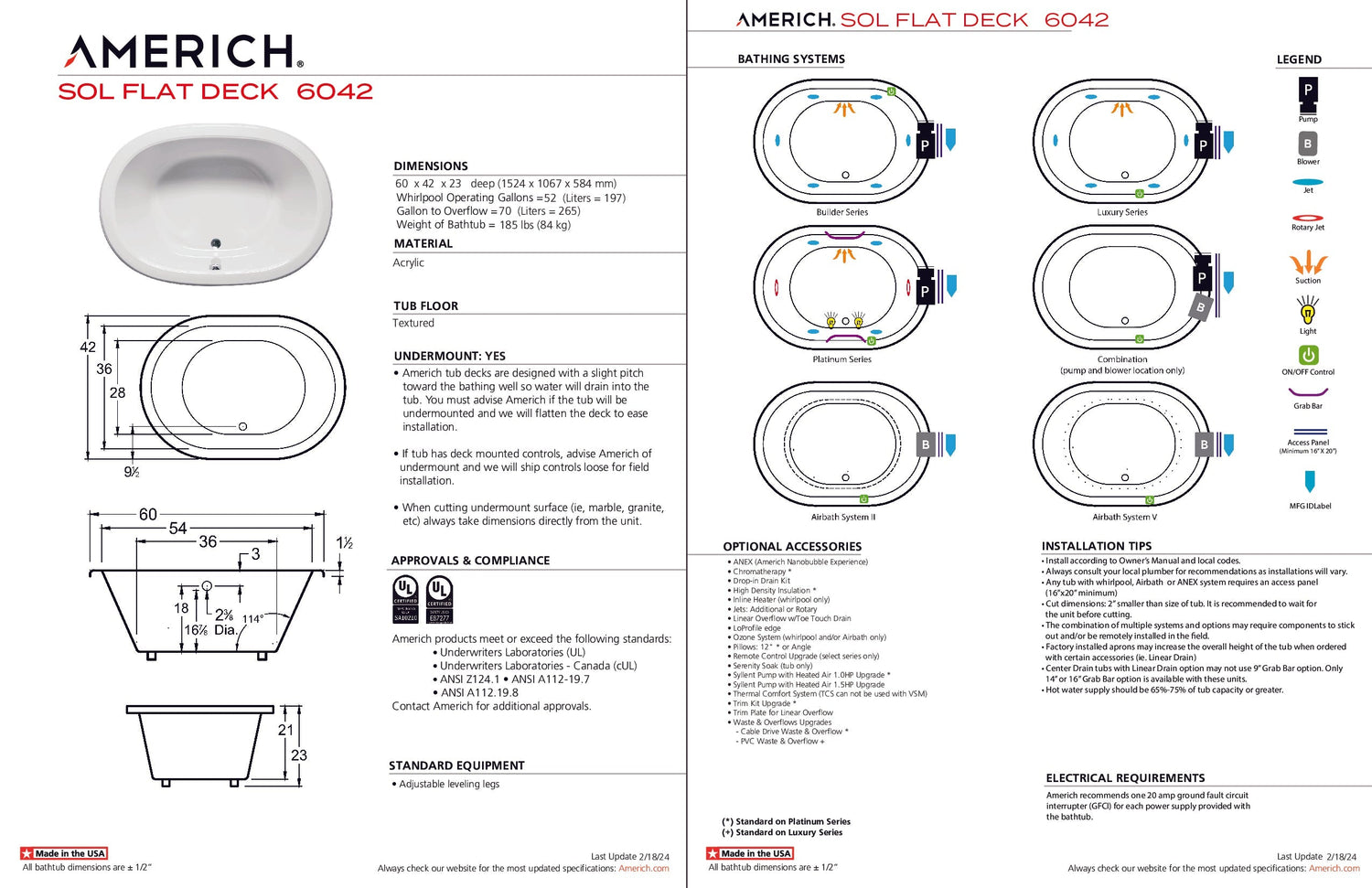 Americh SF6042TA5-BI Sol Flat Deck 6042 - Tub Only / Airbath 5 - Biscuit