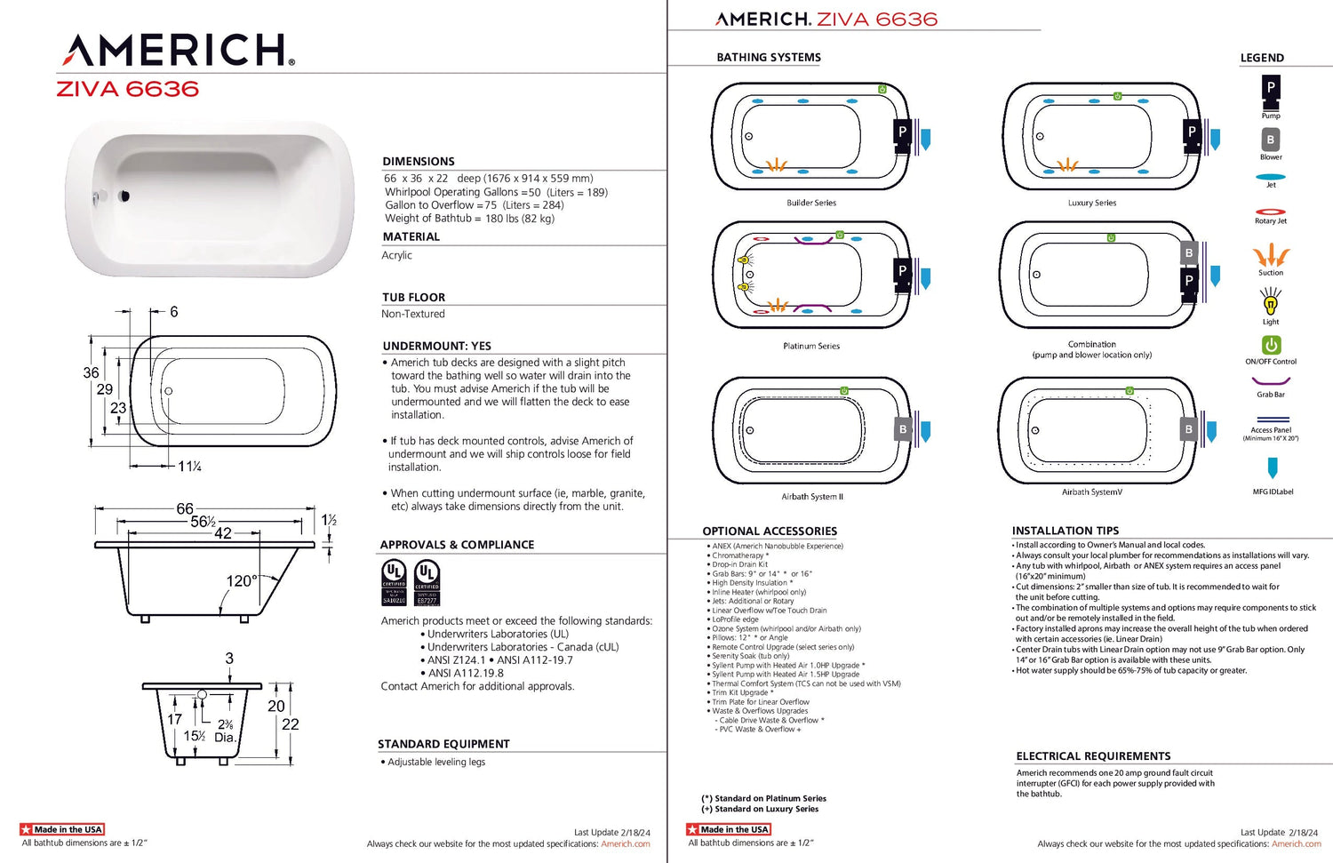 Americh ZI6636TA5-BI Ziva 6636 - Tub Only / Airbath 5 - Biscuit