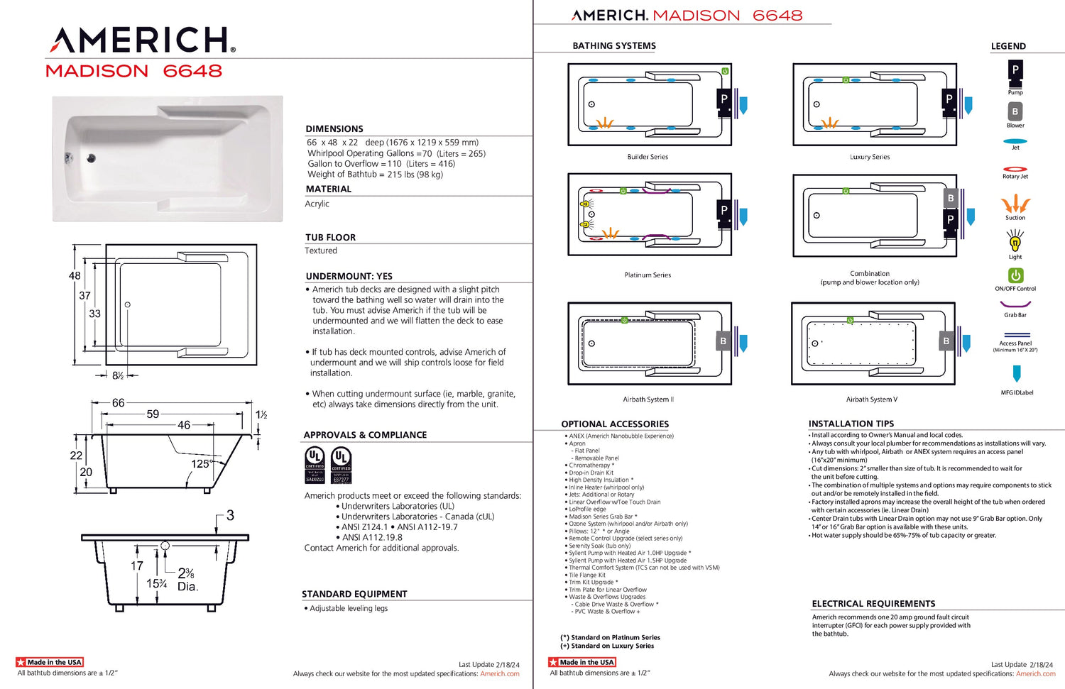 Americh MA6648TA5-BI Madison 6648 - Tub Only / Airbath 5 - Biscuit