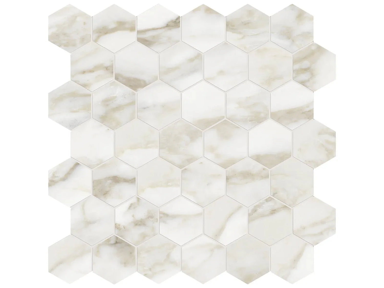 Anatolia Tile La Marca 2 Inch Hexagon Calacatta Honed Porcelain Mosaics. 1 Sheet = .96 Sq. Ft. 4501-0351-0 Calacatta Paonazzo 2" Hexagon Honed
