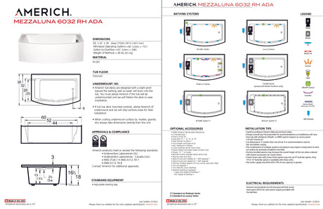Regular price $3,67500UnavailableAmerich MZ6032TRA5-WH Mezzaluna 6032 ADA Right Hand - Tub Only / Airbath 5 - ...