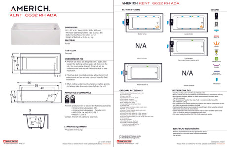 Regular price $3,26250UnavailableAmerich KN6632ADATRA2BI Kent 6632 ADA Right Hand - Tub Only / Airbath 2 - Bis...