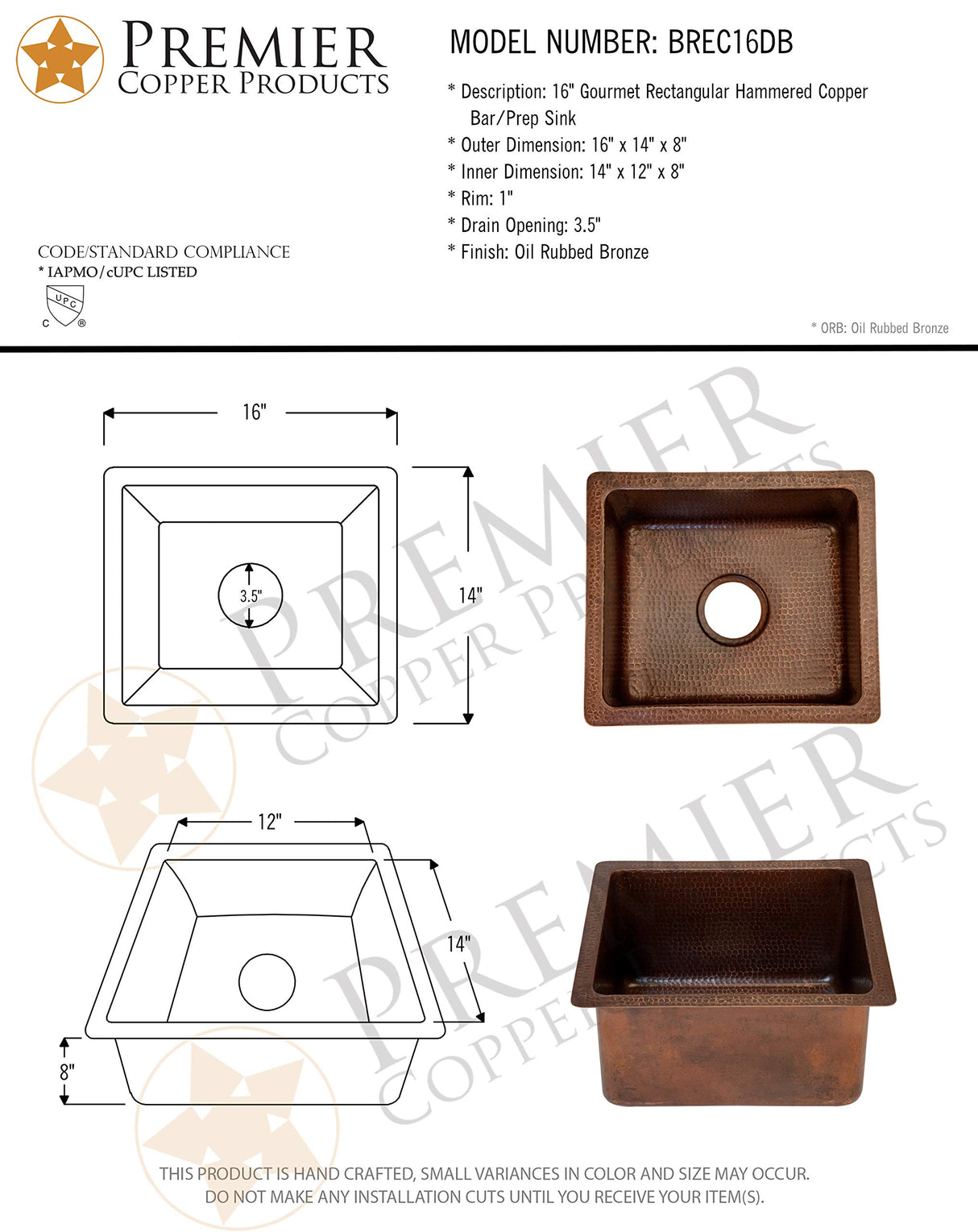 Uncompromising quality, beauty and functionality make up this Premier 16-Inch by 14-Inch by 8-Inch Gourmet Rectangular Hammered Copper Bar/Prep Sink with a 3.5-Inch Drain Opening. Built like a kitchen sink with flat bottom and sheer sides. Will support garbage disposal. Green recyclable products like copper sinks are a must have in today's modern home. This product is sure to impress your guests and satisfaction is always guaranteed. Rectangular design. Hammered Copper Surface. Dimensions: inner 14-Inch by 12-Inch by 8-Inch, outer 16-Inch by 14-Inch by 8-Inch. Installation Type: under counter or surface-mount. 1-Inch flat rim. The countertop depth measures 17-Inch front to back. Material gauge: Industry Best (14-guage or .0625-Inch). Drain size is 3.5-Inch. Suggested Drain Models: D-130ORB, D-132ORB (Drain sold separately). The faucet mounting position is counter deck mount. It is handmade, 100-Percent recyclable and made of 99.7-Percent pure recycled copper. It is Lead Free (less than 0.01-Percent). Suggested accessories: Installation Silicone for Model: C900-ORB, Copper Sink Wax- Model: W900-WAX, Copper Tiles for Models: T2DBH, T4DBH, T4DBS, T4DBG, T4DBF, T6DBH.From the ManufacturerUncompromising quality, beauty and functionality make up this Premier 16-Inch by 14-Inch by 8-Inch Gourmet Rectangular Hammered Copper Bar/Prep Sink with a 3.5-Inch Drain Opening. Built like a kitchen sink with flat bottom and sheer sides. Will support garbage disposal. Green recyclable products like copper sinks are a must have in today's modern home. This product is sure to impress your guests and satisfaction is always guaranteed. Rectangular design. Hammered Copper Surface. Dimensions: inner 14-Inch by 12-Inch by 8-Inch, outer 16-Inch by 14-Inch by 8-Inch. Installation Type: under counter or surface-mount. 1-Inch flat rim. The countertop depth measures 17-Inch front to back. Material gauge: Industry Best (14-guage or .0625-Inch). Drain size is 3.5-Inch. Suggested Drain Models: D-130ORB, D-132ORB (Drain sold separately). The faucet mounting position is counter deck mount. It is handmade, 100-Percent recyclable and made of 99.7-Percent pure recycled copper. It is Lead Free (less than 0.01-Percent). Suggested accessories: Installation Silicone for Model: C900-ORB, Copper Sink Wax- Model: W900-WAX, Copper Tiles for Models: T2DBH, T4DBH, T4DBS, T4DBG, T4DBF, T6DBH.