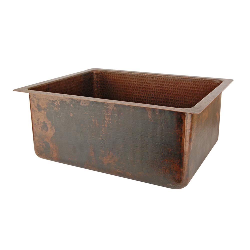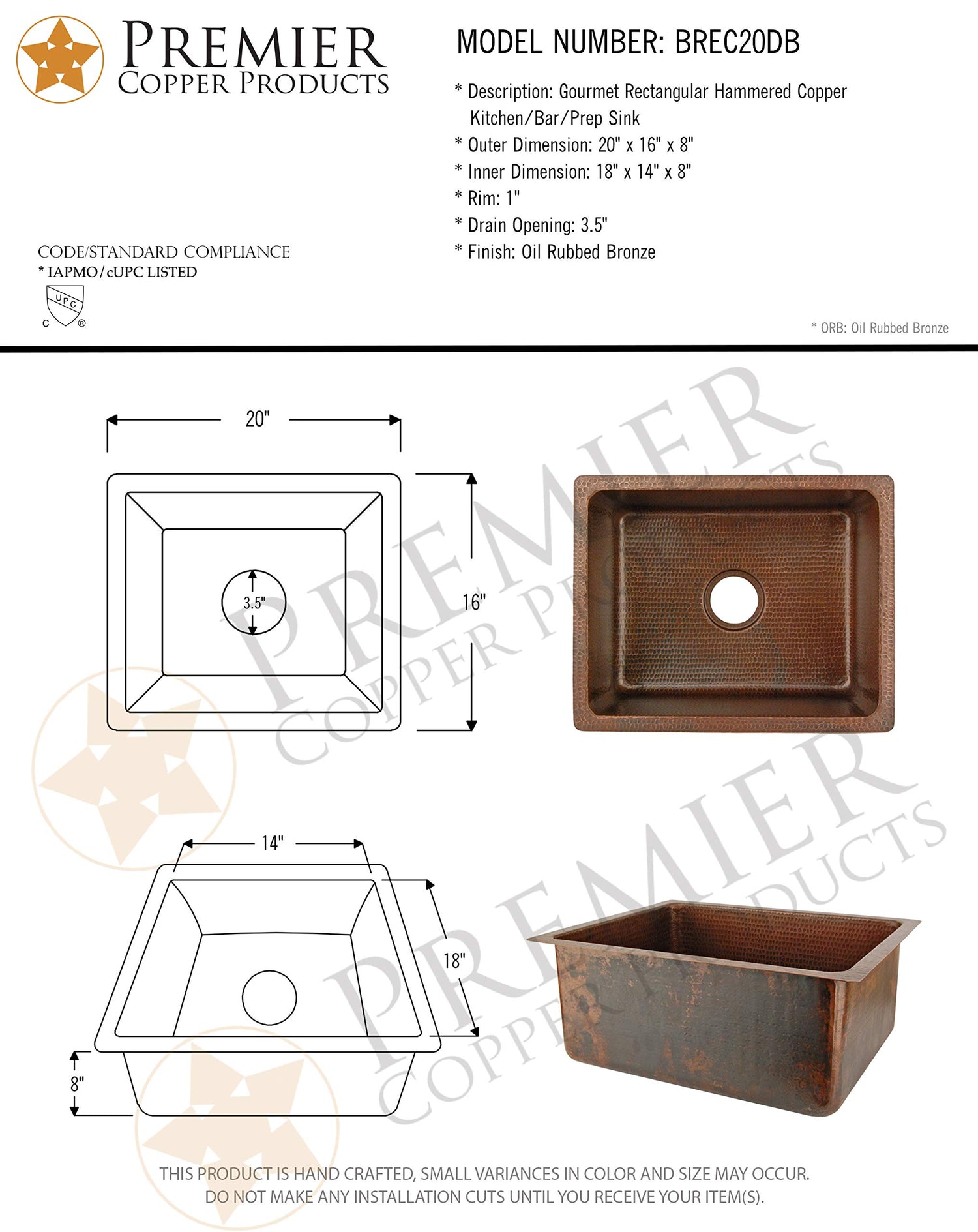 Uncompromising quality, beauty and functionality make up this Premier 20-Inch Hammered Copper Single Basin Sink. This sink is perfect for a Kitchen Prep Area, Bar, or a Kitchenette Setting. Green recyclable products like copper sinks are a must have in today's modern home. This product is sure to impress your guests and satisfaction is always guaranteed. Single Basin Sink Hammered Copper Surface inner dimensions: 18-Inch by 14-Inch by 8-Inch, outer 20-Inch by 16-Inch by 8-Inch. Installation Type: under counter or surface-mount. The countertop depth measures 19-Inch front to back. Material gauge: Industry Best (14-guage or .0625-Inch). Drain size is 3.5-Inch. Suggested Drain Models: D-130ORB, D-132ORB (Drain sold separately). Faucet Mounting: Counter deck mount. It is handmade, 100-Percent recyclable and made of 99.7-Percent pure recycled copper. It is Lead Free (less than 0.01-Percent). Suggested accessories: Installation Silicone for Model: C900-ORB, Copper Sink Wax- Model: W900-WAX, Copper Switch plates for Models: SO2, SO4, SCOT, SR1-SR4, ST1-ST4, SB1.From the ManufacturerUncompromising quality, beauty and functionality make up this Premier 20-Inch Hammered Copper Single Basin Sink. This sink is perfect for a Kitchen Prep Area, Bar, or a Kitchenette Setting. Green recyclable products like copper sinks are a must have in today's modern home. This product is sure to impress your guests and satisfaction is always guaranteed. Single Basin Sink Hammered Copper Surface inner dimensions: 18-Inch by 14-Inch by 8-Inch, outer 20-Inch by 16-Inch by 8-Inch. Installation Type: under counter or surface-mount. The countertop depth measures 19-Inch front to back. Material gauge: Industry Best (14-guage or .0625-Inch). Drain size is 3.5-Inch. Suggested Drain Models: D-130ORB, D-132ORB (Drain sold separately). Faucet Mounting: Counter deck mount. It is handmade, 100-Percent recyclable and made of 99.7-Percent pure recycled copper. It is Lead Free (less than 0.01-Percent). Suggested accessories: Installation Silicone for Model: C900-ORB, Copper Sink Wax- Model: W900-WAX, Copper Switch plates for Models: SO2, SO4, SCOT, SR1-SR4, ST1-ST4, SB1.