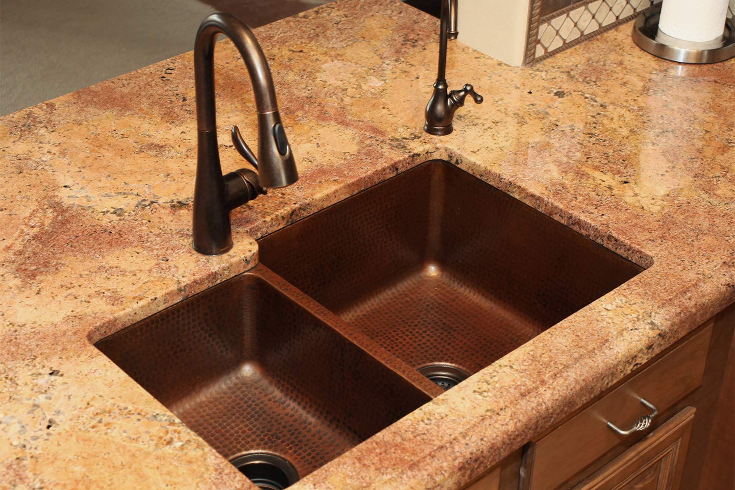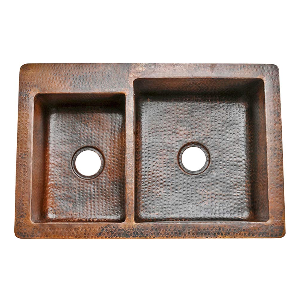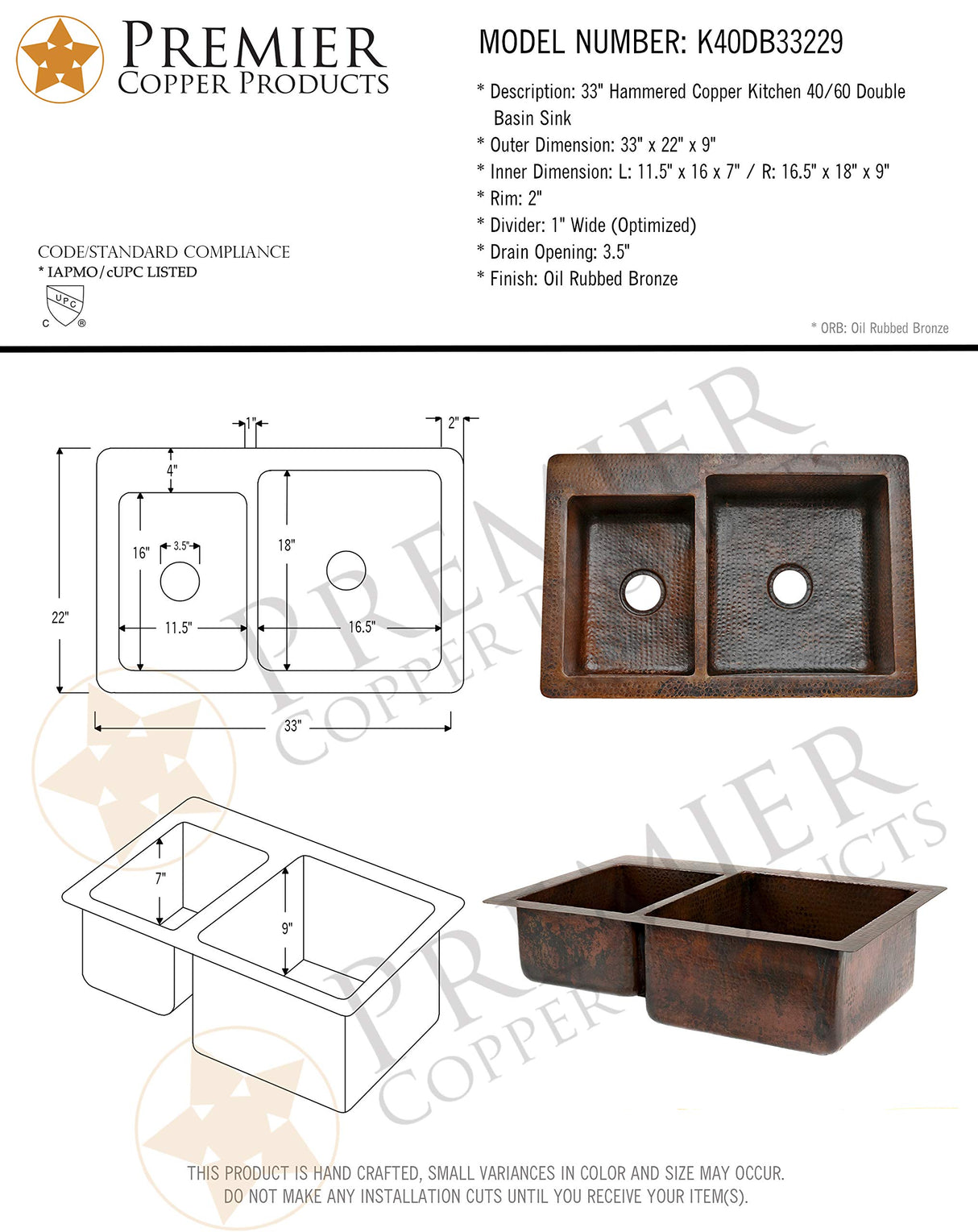 Uncompromising quality, beauty and functionality make up this Premier 33-Inch Copper Hammered Kitchen 40/60 Double Basin Sink. Each Premier Copper Sink is optimized to allow ample room to deck mount your faucet in a standard 25-Inch countertop. Green recyclable products like copper sinks are a must have in today's modern home. This product is sure to impress your guests and satisfaction is always guaranteed. 40/60 Basin Split. Hammered Copper Surface. Dimensions: inner large right basin 16.5-Inch by 18-Inch by 9-Inch, small left basin 11.5-Inch by 16-Inch by 7-Inch, outer 33-Inch by 22-Inch by 9-Inch. Installation Type: under counter or surface-mount. Divider: 1-Inch wide (optimized). Countertop Depth Required: 25-Inch front to back. Material gauge: Industry Best (14-guage or .0625-Inch). Drain size is 3.5-Inch. Suggested Drain Models: D-130ORB, D-132ORB (Drain sold separately). The faucet mounting position is counter deck mount. It is handmade, 100-Percent recyclable and made of 99.7-Percent pure recycled copper. It is Lead Free (less than 0.01-Percent). Suggested accessories: Installation Silicone for Model: C900-ORB, Copper Sink Wax- Model: W900-WAX, Copper, Pendant Lights for Models: L100DB-L500DB.From the ManufacturerUncompromising quality, beauty and functionality make up this Premier 33-Inch Copper Hammered Kitchen 40/60 Double Basin Sink. Each Premier Copper Sink is optimized to allow ample room to deck mount your faucet in a standard 25-Inch countertop. Green recyclable products like copper sinks are a must have in today's modern home. This product is sure to impress your guests and satisfaction is always guaranteed. 40/60 Basin Split. Hammered Copper Surface. Dimensions: inner large right basin 16.5-Inch by 18-Inch by 9-Inch, small left basin 11.5-Inch by 16-Inch by 7-Inch, outer 33-Inch by 22-Inch by 9-Inch. Installation Type: under counter or surface-mount. Divider: 1-Inch wide (optimized). Countertop Depth Required: 25-Inch front to back. Material gauge: Industry Best (14-guage or .0625-Inch). Drain size is 3.5-Inch. Suggested Drain Models: D-130ORB, D-132ORB (Drain sold separately). The faucet mounting position is counter deck mount. It is handmade, 100-Percent recyclable and made of 99.7-Percent pure recycled copper. It is Lead Free (less than 0.01-Percent). Suggested accessories: Installation Silicone for Model: C900-ORB, Copper Sink Wax- Model: W900-WAX, Copper, Pendant Lights for Models: L100DB-L500DB.