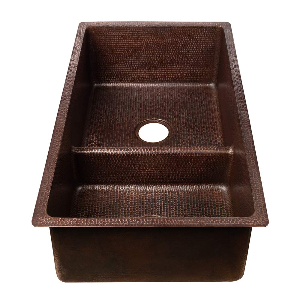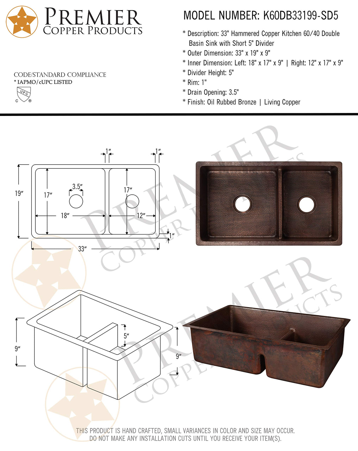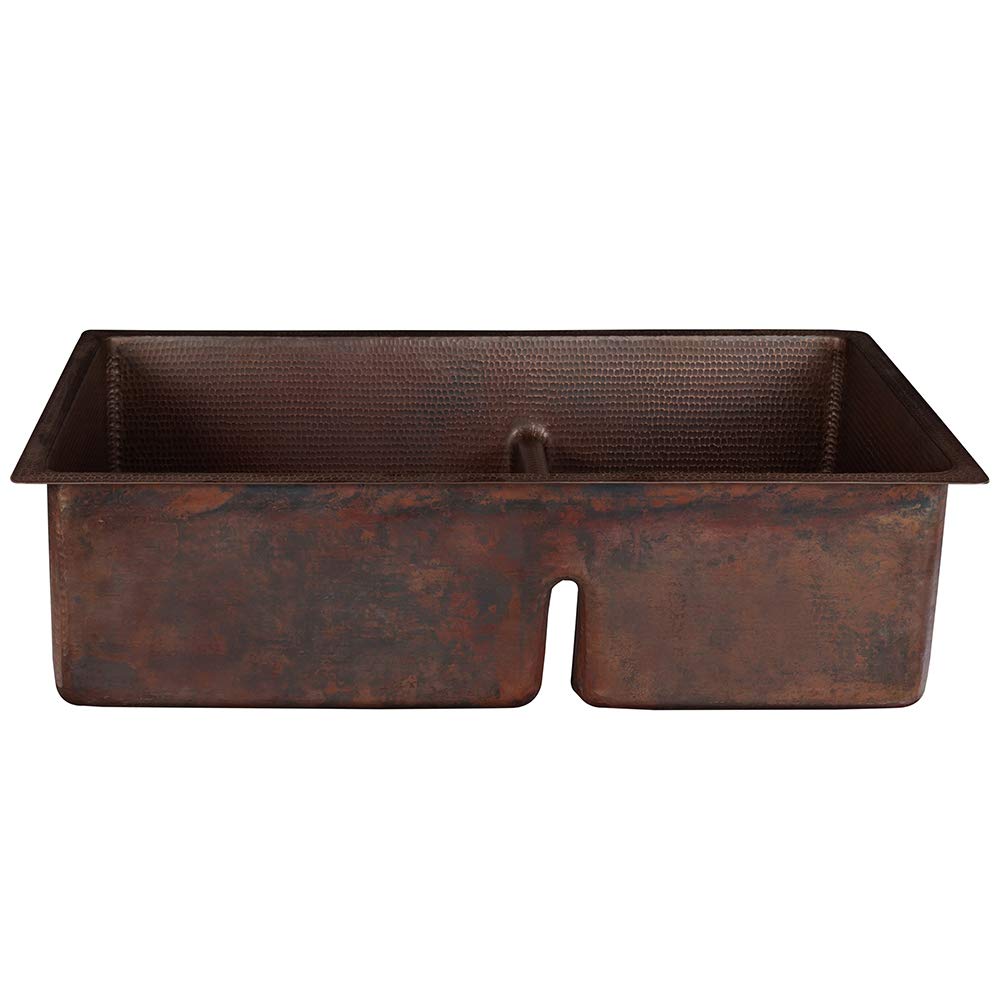 Premier Copper Products K60DB33199-SD5 33" Hammered Copper Kitchen 60/40 Double Basin Sink with Short 5" Divider