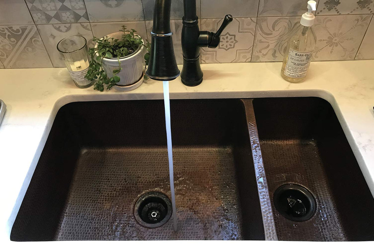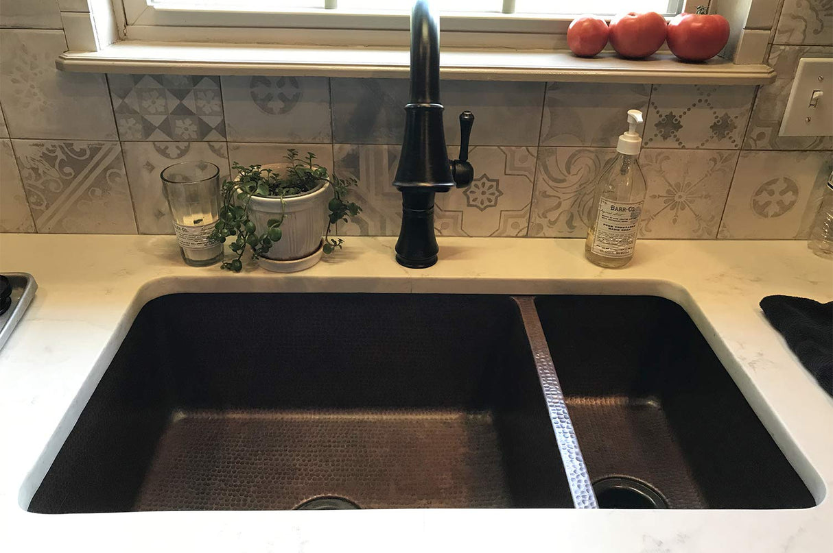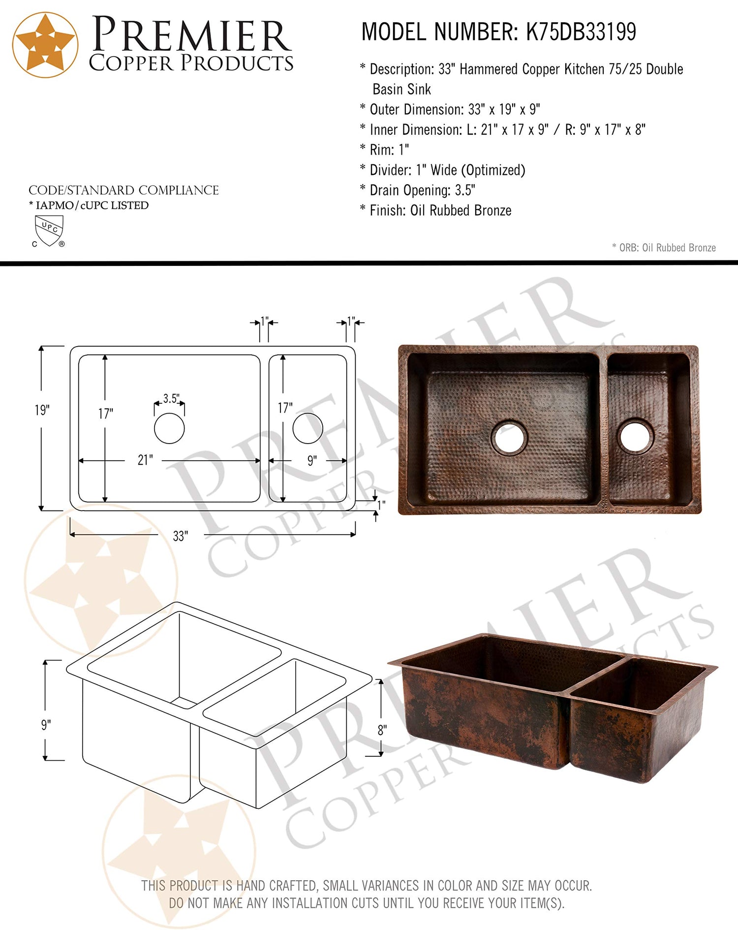 Uncompromising quality, beauty and functionality make up this Premier 33-Inch Copper Hammered Kitchen 75/25 Double Basin Sink. Each Premier Copper Sink is optimized to allow ample room to deck mount your faucet in a standard 25-Inch countertop. Green recyclable products like copper sinks are a must have in today's modern home. This product is sure to impress your guests and satisfaction is always guaranteed. 75/25 Basin Split. Hammered Copper Surface. Dimensions: left large basin 21-Inch by 17-Inch by 9-Inch right small basin 9-Inch by 17-Inch by 8-Inch, outer 33-Inch by 19-Inch by 9-Inch. Installation Type: under counter or surface-mount. Divider: 1-Inch wide (optimized). Countertop Depth Required: 22-Inch front to back. Material gauge: Industry Best (14-guage or .0625-Inch). Drain size is 3.5-Inch. Suggested Drain Models: D-130ORB, D-132ORB (Drain sold separately). The faucet mounting position is counter deck mount. It is handmade, 100-Percent recyclable and made of 99.7-Percent pure recycled copper. It is Lead Free (less than 0.01-Percent). Suggested accessories: Installation Silicone for Model: C900-ORB, Copper Sink Wax- Model: W900-WAX, Copper Pendant Lights for Models: L100DB-L500DB.From the ManufacturerUncompromising quality, beauty and functionality make up this Premier 33-Inch Copper Hammered Kitchen 75/25 Double Basin Sink. Each Premier Copper Sink is optimized to allow ample room to deck mount your faucet in a standard 25-Inch countertop. Green recyclable products like copper sinks are a must have in today's modern home. This product is sure to impress your guests and satisfaction is always guaranteed. 75/25 Basin Split. Hammered Copper Surface. Dimensions: left large basin 21-Inch by 17-Inch by 9-Inch right small basin 9-Inch by 17-Inch by 8-Inch, outer 33-Inch by 19-Inch by 9-Inch. Installation Type: under counter or surface-mount. Divider: 1-Inch wide (optimized). Countertop Depth Required: 22-Inch front to back. Material gauge: Industry Best (14-guage or .0625-Inch). Drain size is 3.5-Inch. Suggested Drain Models: D-130ORB, D-132ORB (Drain sold separately). The faucet mounting position is counter deck mount. It is handmade, 100-Percent recyclable and made of 99.7-Percent pure recycled copper. It is Lead Free (less than 0.01-Percent). Suggested accessories: Installation Silicone for Model: C900-ORB, Copper Sink Wax- Model: W900-WAX, Copper Pendant Lights for Models: L100DB-L500DB.
