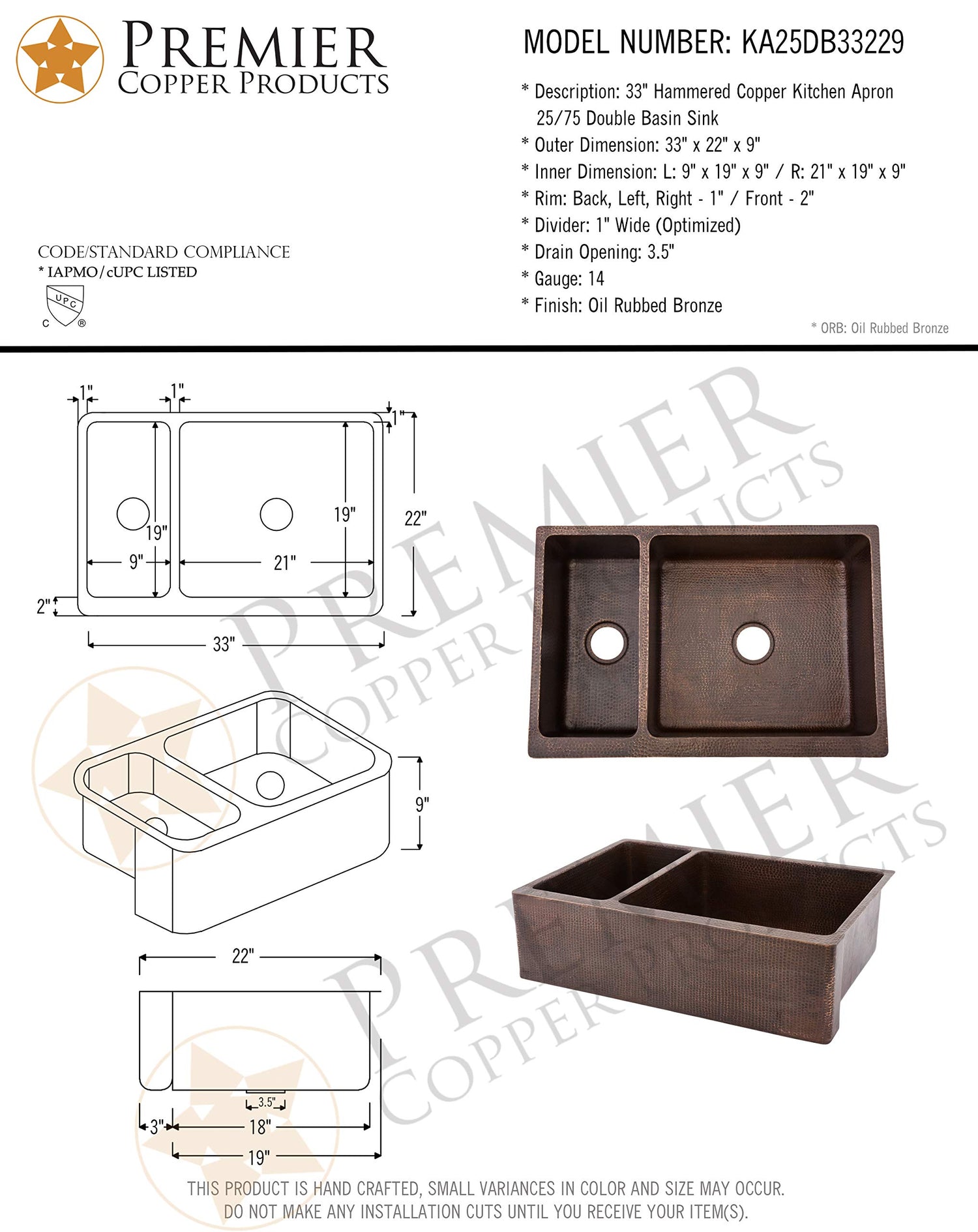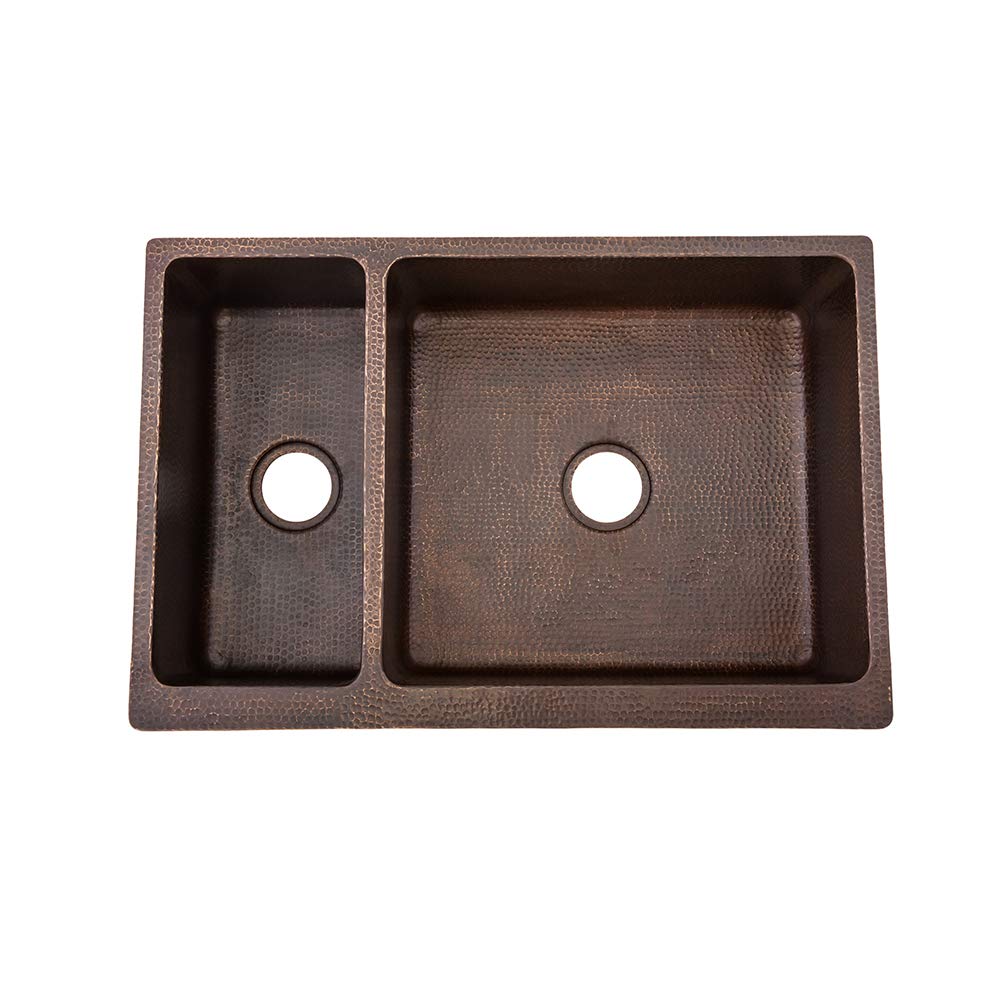 33-Inch Hammered Copper Kitchen Apron 25/75 Double Basin Sink Each Premier Copper Sink is optimized to allow ample room to deck mount your faucet in a standard 25-Inch countertop. Green recyclable products like copper sinks are a must have in today's modern home. This product is sure to impress your guests and satisfaction is always guaranteed. Apron Front 25/75 Basin Split. Hammered Copper Surface. Dimensions: inner large right basin 21-Inch by 19-Inch by 9-Inch, small left basin 9-Inch by 19-Inch by 8-Inch, outer 33-Inch by 22-Inch by 9-Inch, apron depth 9-Inch. Installation Type: under counter or surface-mount. Divider: 1-Inch wide (optimized). Countertop Depth Required: 25-Inch front to back. Material gauge: Industry Best (14-guage or .0625-Inch). Drain size is 3.5-Inch. Suggested Drain Models: D-130ORB, D-132ORB (Drain sold separately). The faucet mounting position is counter deck mount. It is handmade, 100-Percent recyclable and made of 99.7-Percent pure recycled copper. It is Lead Free (less than 0.01-Percent). Suggested accessories: Installation Silicone for Model: C900-ORB, Copper Sink Wax- Model: W900-WAX, Pull Down Kitchen Faucet - Model: K-PD01ORB.From the Manufacturer33-Inch Hammered Copper Kitchen Apron 25/75 Double Basin Sink Each Premier Copper Sink is optimized to allow ample room to deck mount your faucet in a standard 25-Inch countertop. Green recyclable products like copper sinks are a must have in today's modern home. This product is sure to impress your guests and satisfaction is always guaranteed. Apron Front 25/75 Basin Split. Hammered Copper Surface. Dimensions: inner large right basin 21-Inch by 19-Inch by 9-Inch, small left basin 9-Inch by 19-Inch by 8-Inch, outer 33-Inch by 22-Inch by 9-Inch, apron depth 9-Inch. Installation Type: under counter or surface-mount. Divider: 1-Inch wide (optimized). Countertop Depth Required: 25-Inch front to back. Material gauge: Industry Best (14-guage or .0625-Inch). Drain size is 3.5-Inch. Suggested Drain Models: D-130ORB, D-132ORB (Drain sold separately). The faucet mounting position is counter deck mount. It is handmade, 100-Percent recyclable and made of 99.7-Percent pure recycled copper. It is Lead Free (less than 0.01-Percent). Suggested accessories: Installation Silicone for Model: C900-ORB, Copper Sink Wax- Model: W900-WAX, Pull Down Kitchen Faucet - Model: K-PD01ORB.