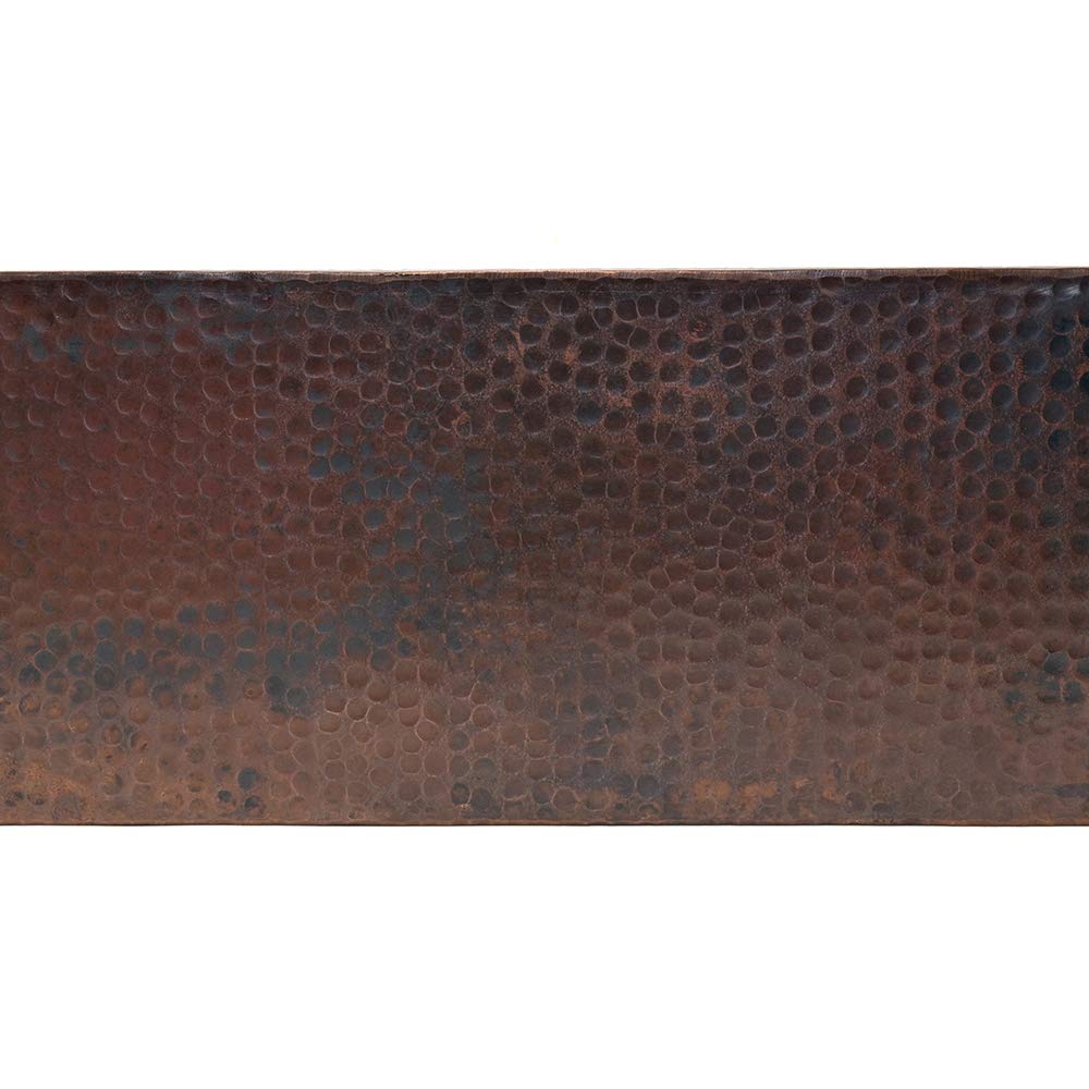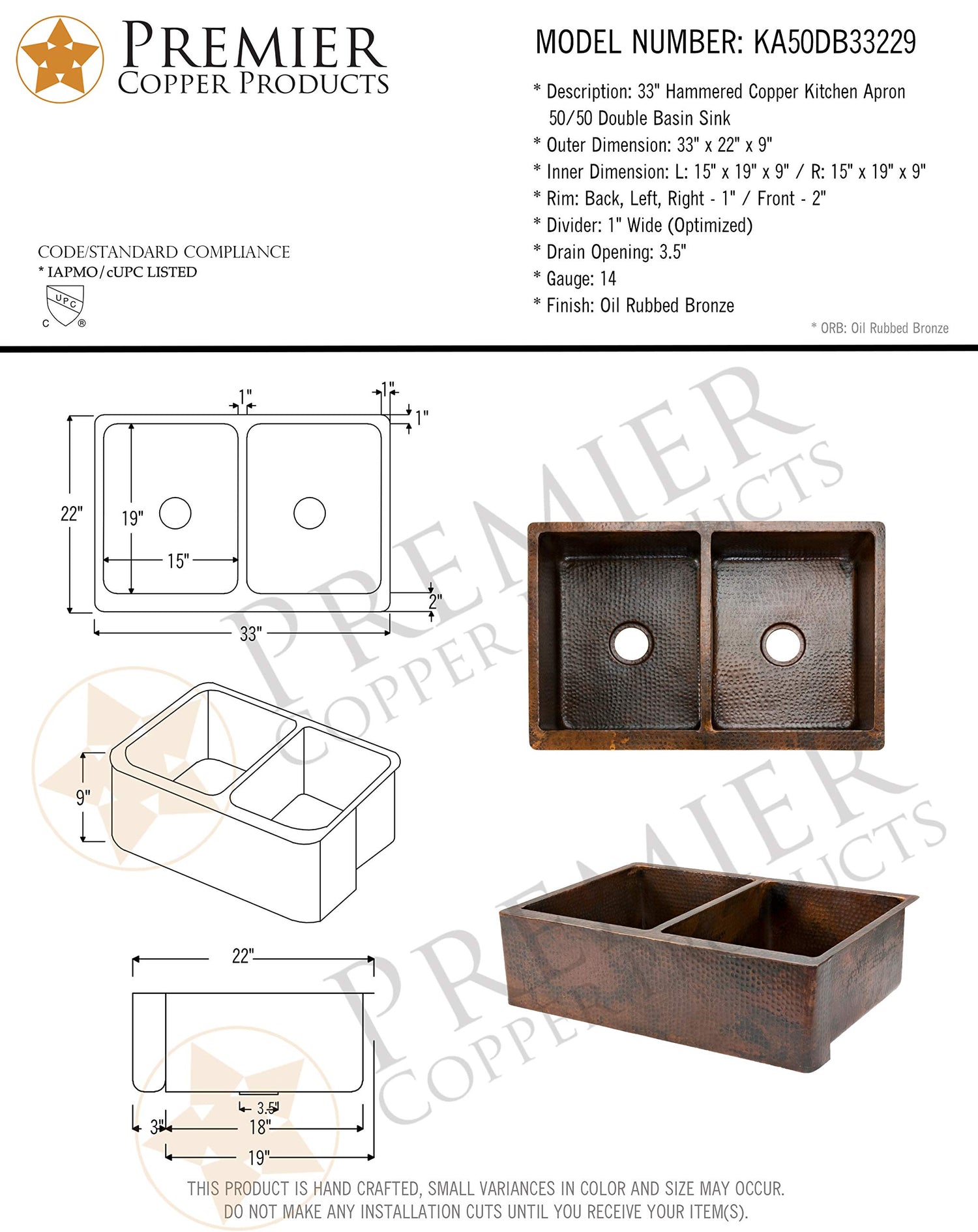 Uncompromising quality, beauty and functionality make up this Premier 33-Inch Copper Hammered Kitchen Apron 50/50 Double Basin Sink. Each Premier Copper Sink is optimized to allow ample room to deck mount your faucet in a standard 25-Inch countertop. Green recyclable products like copper sinks are a must have in today's modern home. This product is sure to impress your guests and satisfaction is always guaranteed. Apron Front 50/50 Basin Split. Hammered Copper Surface. Dimensions: inner left basin 15-Inch by 19-Inch by 9-Inch, right basin 15-Inch by 19-Inch by 9-Inch, outer 33-Inch by 22-Inch by 9-Inch, apron depth 9-Inch. Installation Type: under counter or surface-mount. Divider: 1-Inch wide (optimized). Countertop Depth Required: 25-Inch front to back. Material gauge: Industry Best (14-guage or .0625-Inch). Drain size is 3.5-Inch. Suggested Drain Models: D-130ORB, D-132ORB (Drain sold separately). The faucet mounting position is counter deck mount. It is handmade, 100-Percent recyclable and made of 99.7-Percent pure recycled copper. It is Lead Free (less than 0.01-Percent). Suggested accessories: Installation Silicone for Model: C900-ORB, Copper Sink Wax- Model: W900-WAX, Copper Switch plates for Models: SO2, SO4, SCOT, SR1-SR4, ST1-ST4, SB1.From the ManufacturerUncompromising quality, beauty and functionality make up this Premier 33-Inch Copper Hammered Kitchen Apron 50/50 Double Basin Sink. Each Premier Copper Sink is optimized to allow ample room to deck mount your faucet in a standard 25-Inch countertop. Green recyclable products like copper sinks are a must have in today's modern home. This product is sure to impress your guests and satisfaction is always guaranteed. Apron Front 50/50 Basin Split. Hammered Copper Surface. Dimensions: inner left basin 15-Inch by 19-Inch by 9-Inch, right basin 15-Inch by 19-Inch by 9-Inch, outer 33-Inch by 22-Inch by 9-Inch, apron depth 9-Inch. Installation Type: under counter or surface-mount. Divider: 1-Inch wide (optimized). Countertop Depth Required: 25-Inch front to back. Material gauge: Industry Best (14-guage or .0625-Inch). Drain size is 3.5-Inch. Suggested Drain Models: D-130ORB, D-132ORB (Drain sold separately). The faucet mounting position is counter deck mount. It is handmade, 100-Percent recyclable and made of 99.7-Percent pure recycled copper. It is Lead Free (less than 0.01-Percent). Suggested accessories: Installation Silicone for Model: C900-ORB, Copper Sink Wax- Model: W900-WAX, Copper Switch plates for Models: SO2, SO4, SCOT, SR1-SR4, ST1-ST4, SB1.