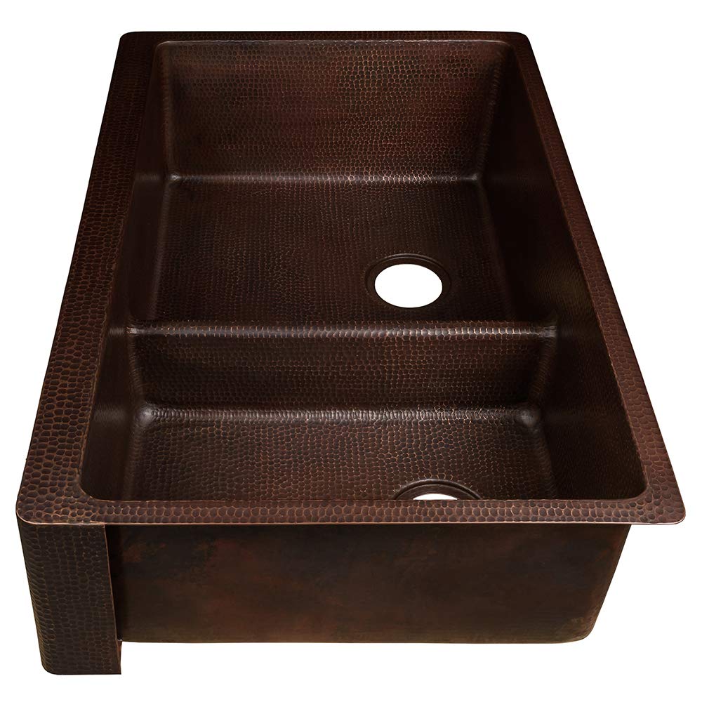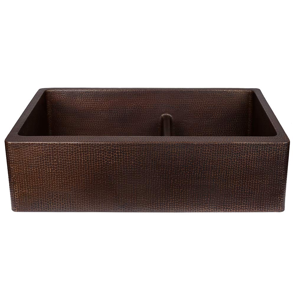 Premier Copper Products KA60DB33229-SD5 33-Inch Hammered Copper Kitchen Apron 60/40 Double Basin Sink with Short 5-Inch Divider…