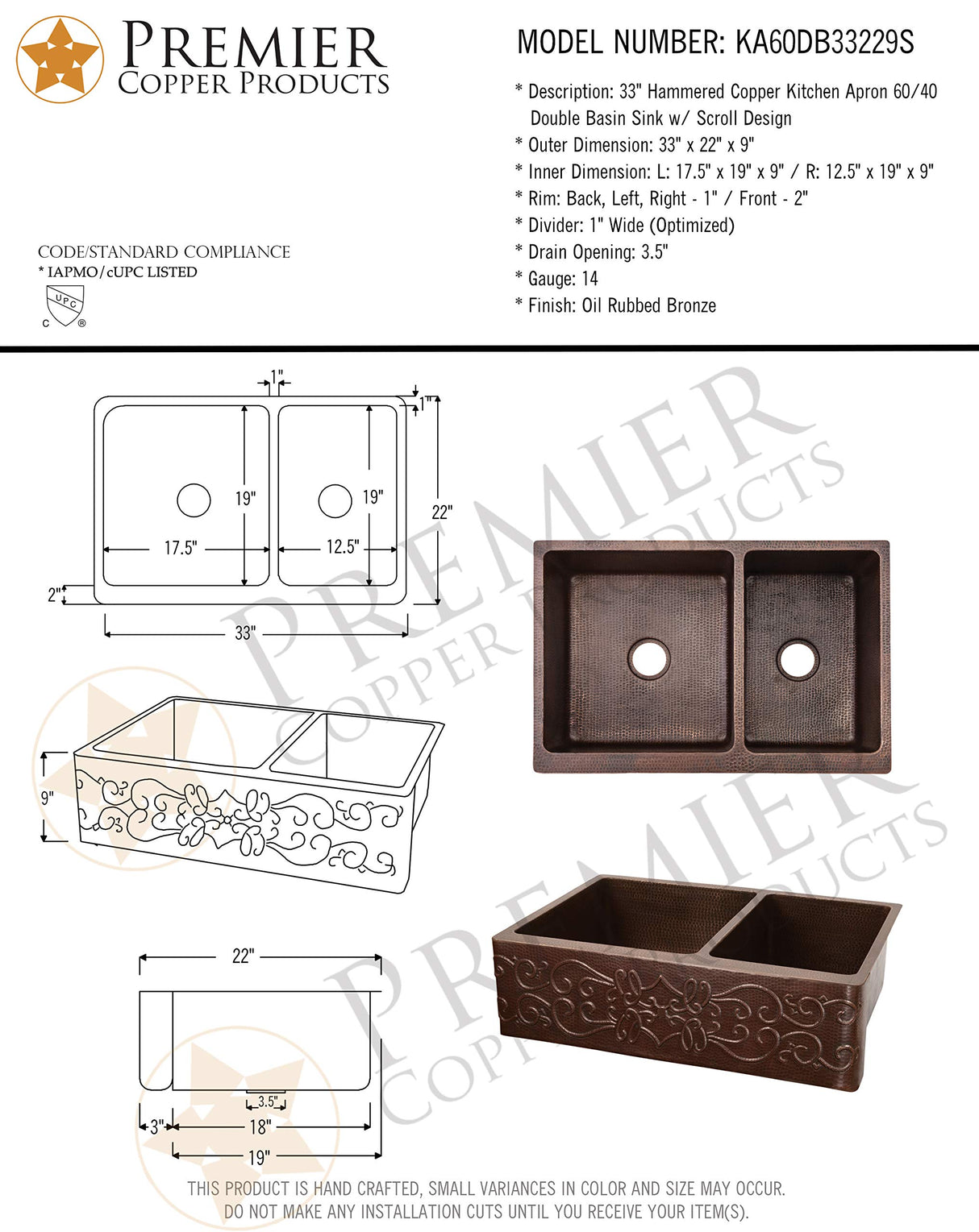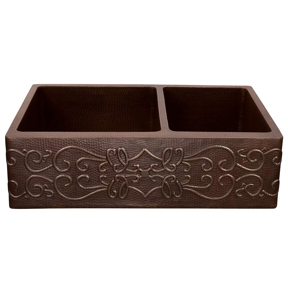 Premier Copper Products KA60DB33229S Handmade 33-Inch Hammered Copper Kitchen Double Basin Sink