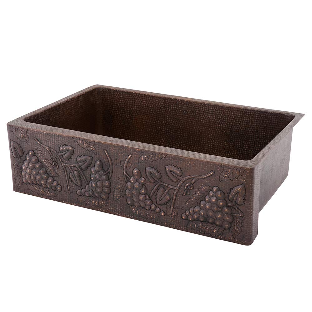 33-Inch Hammered Copper Kitchen Vineyard Grape Apron Single Basin Sink Each Premier Copper Sink is optimized to allow ample room to deck mount your faucet in a standard 25-Inch countertop. Green recyclable products like copper sinks are a must have in today's modern home. This product is sure to impress your guests and satisfaction is always guaranteed. Apron Front Single Basin Sink Apron. Design: Vineyard Grape. Hammered copper surface. Dimensions: inner 31-Inch by 19-Inch by 9-Inch, outer 33-Inch by 22-Inch by 9-Inch, apron depth 9-Inch. Installation Type: under counter or surface-mount. Countertop Depth Required: 25-Inch front to back. Material gauge: Industry Best (14-guage or .0625-Inch). Drain size is 3.5-Inch. Suggested Drain Models: D-130ORB, D-132ORB (Drain sold separately). The faucet mounting position is counter deck mount. It is handmade, 100-Percent recyclable and made of 99.7-Percent pure recycled copper. It is Lead Free (less than 0.01-Percent). Suggested accessories: Installation Silicone for Model: C900-ORB, Copper Sink Wax- Model: W900-WAX, Pull Down Kitchen Faucet - Model: K-PD01ORB.From the Manufacturer33-Inch Hammered Copper Kitchen Vineyard Grape Apron Single Basin Sink Each Premier Copper Sink is optimized to allow ample room to deck mount your faucet in a standard 25-Inch countertop. Green recyclable products like copper sinks are a must have in today's modern home. This product is sure to impress your guests and satisfaction is always guaranteed. Apron Front Single Basin Sink Apron. Design: Vineyard Grape. Hammered copper surface. Dimensions: inner 31-Inch by 19-Inch by 9-Inch, outer 33-Inch by 22-Inch by 9-Inch, apron depth 9-Inch. Installation Type: under counter or surface-mount. Countertop Depth Required: 25-Inch front to back. Material gauge: Industry Best (14-guage or .0625-Inch). Drain size is 3.5-Inch. Suggested Drain Models: D-130ORB, D-132ORB (Drain sold separately). The faucet mounting position is counter deck mount. It is handmade, 100-Percent recyclable and made of 99.7-Percent pure recycled copper. It is Lead Free (less than 0.01-Percent). Suggested accessories: Installation Silicone for Model: C900-ORB, Copper Sink Wax- Model: W900-WAX, Pull Down Kitchen Faucet - Model: K-PD01ORB.