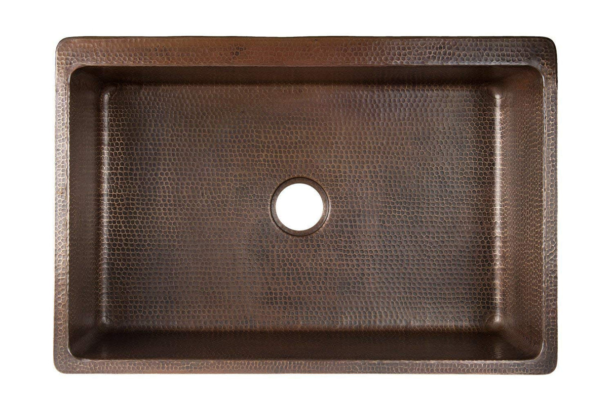 Premier Copper Products 33-inch Copper Kitchen Apron Single Basin Sink with Vineyard and Apron Front Nickel Background