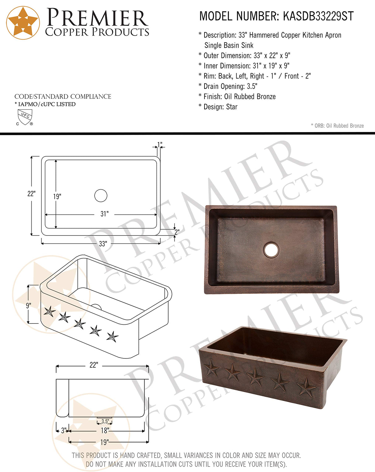 33-Inch Hammered Copper Kitchen Star Apron Single Basin Sink Each Premier Copper Sink is optimized to allow ample room to deck mount your faucet in a standard 25-Inch countertop. Green recyclable products like copper sinks are a must have in today's modern home. This product is sure to impress your guests and satisfaction is always guaranteed. Apron Front Single Basin Sink Apron. Design: 5 Star. Hammered copper surface. Dimensions: inner 31-Inch by 19-Inch by 9-Inch, outer 33-Inch by 22-Inch by 9-Inch, apron depth 9-Inch. Installation Type: under counter or surface-mount. Countertop Depth Required: 25-Inch front to back. Material gauge: Industry Best (14-guage or .0625-Inch). Drain size is 3.5-Inch. Suggested Drain Models: D-130ORB, D-132ORB (Drain sold separately). The faucet mounting position is counter deck mount. It is handmade, 100-Percent recyclable and made of 99.7-Percent pure recycled copper. It is Lead Free (less than 0.01-Percent). Suggested accessories: Installation Silicone for Model: C900-ORB, Copper Sink Wax- Model: W900-WAX, Pull Down Kitchen Faucet - Model: K-PD01ORB.From the Manufacturer33-Inch Hammered Copper Kitchen Star Apron Single Basin Sink Each Premier Copper Sink is optimized to allow ample room to deck mount your faucet in a standard 25-Inch countertop. Green recyclable products like copper sinks are a must have in today's modern home. This product is sure to impress your guests and satisfaction is always guaranteed. Apron Front Single Basin Sink Apron. Design: 5 Star. Hammered copper surface. Dimensions: inner 31-Inch by 19-Inch by 9-Inch, outer 33-Inch by 22-Inch by 9-Inch, apron depth 9-Inch. Installation Type: under counter or surface-mount. Countertop Depth Required: 25-Inch front to back. Material gauge: Industry Best (14-guage or .0625-Inch). Drain size is 3.5-Inch. Suggested Drain Models: D-130ORB, D-132ORB (Drain sold separately). The faucet mounting position is counter deck mount. It is handmade, 100-Percent recyclable and made of 99.7-Percent pure recycled copper. It is Lead Free (less than 0.01-Percent). Suggested accessories: Installation Silicone for Model: C900-ORB, Copper Sink Wax- Model: W900-WAX, Pull Down Kitchen Faucet - Model: K-PD01ORB.