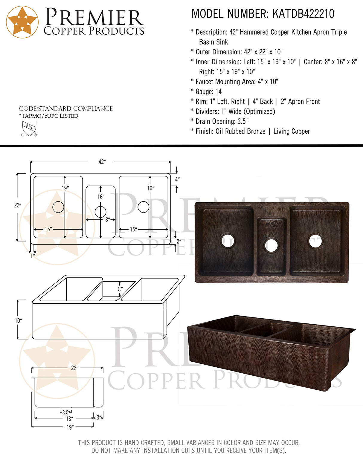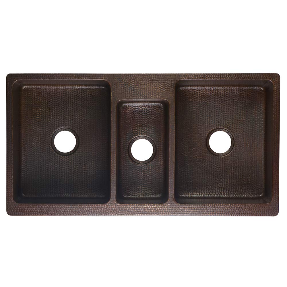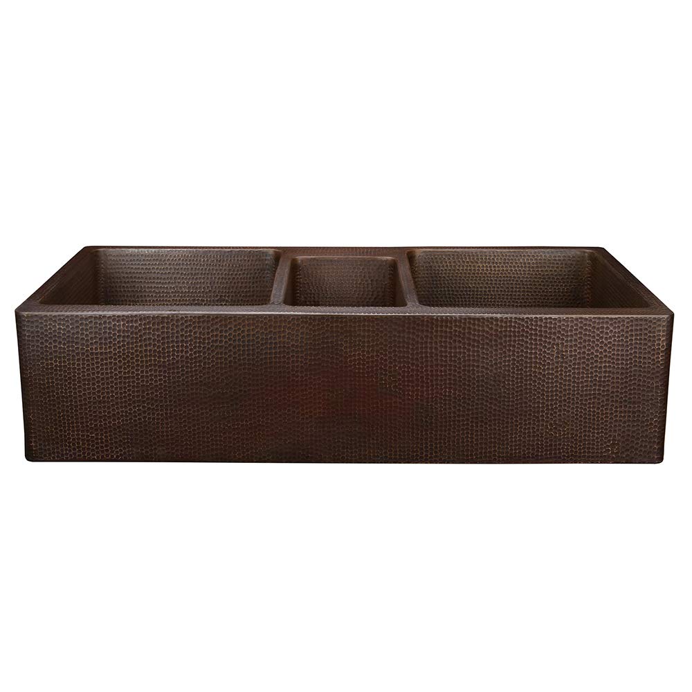 Premier Copper Products KATDB422210 42-Inch Triple Basin Split Hammered Copper Kitchen Apron Triple Basin Sink