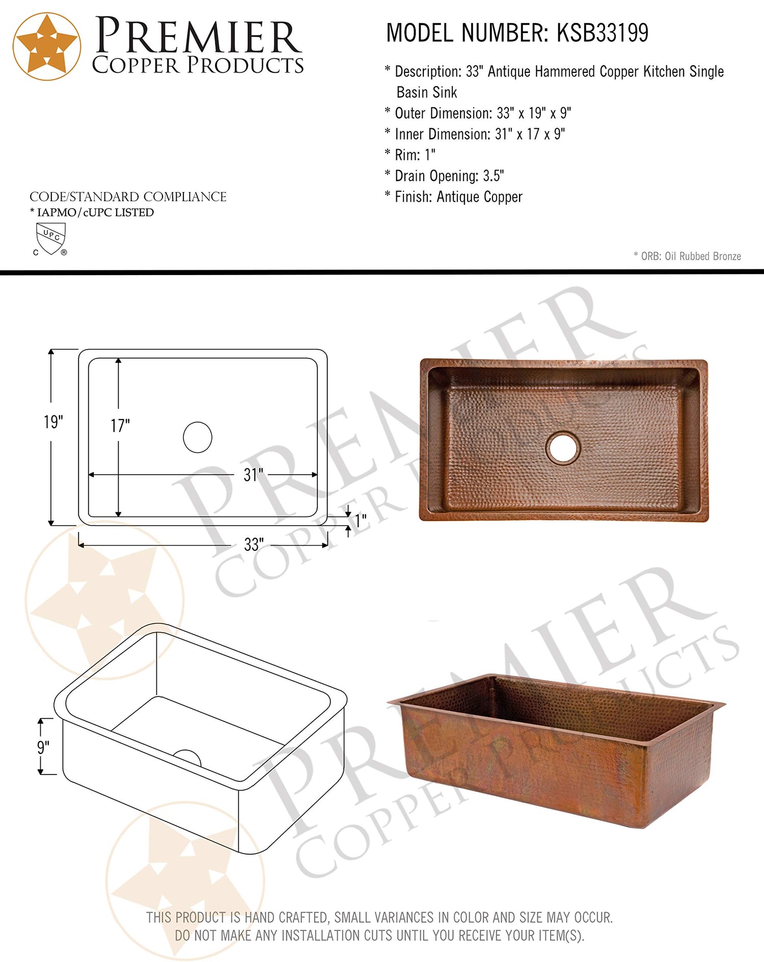 Uncompromising quality, beauty and functionality make up this Premier 33-Inch Copper Hammered Kitchen Single Basin Sink in Antique Copper Color. Each Premier Copper Sink is optimized to allow ample room to deck mount your faucet in a standard 25-Inch countertop. Green recyclable products like copper sinks are a must have in today's modern home. This product is sure to impress your guests and satisfaction is always guaranteed. Hammered Copper Surface Color: Antique Copper (Brown). Note: Due to the handcrafted nature of this product, finish may vary. Dimensions: inner 31-Inch by 17-Inch by 9-Inch, outer 33-Inch by 19-Inch by 9-Inch. Installation Type: under counter or surface-mount. Countertop Depth Required: 22-Inch front to back. Material gauge: Industry Best (14-guage or .0625-Inch). Drain size is 3.5-Inch. Suggested Drain Models: D-130ORB, D-132ORB (Drain sold separately). The faucet mounting position is counter deck mount. It is handmade, 100-Percent recyclable and made of 99.7-Percent pure recycled copper. It is Lead Free (less than 0.01-Percent). Suggested accessories: Installation Silicone for Model: C900-ORB, Copper Sink Wax- Model: W900-WAX, Copper Tiles for Models: T2DBH, T4DBH, T4DBS, T4DBG, T4DBF, T6DBH.From the ManufacturerUncompromising quality, beauty and functionality make up this Premier 33-Inch Copper Hammered Kitchen Single Basin Sink in Antique Copper Color. Each Premier Copper Sink is optimized to allow ample room to deck mount your faucet in a standard 25-Inch countertop. Green recyclable products like copper sinks are a must have in today's modern home. This product is sure to impress your guests and satisfaction is always guaranteed. Hammered Copper Surface Color: Antique Copper (Brown). Note: Due to the handcrafted nature of this product, finish may vary. Dimensions: inner 31-Inch by 17-Inch by 9-Inch, outer 33-Inch by 19-Inch by 9-Inch. Installation Type: under counter or surface-mount. Countertop Depth Required: 22-Inch front to back. Material gauge: Industry Best (14-guage or .0625-Inch). Drain size is 3.5-Inch. Suggested Drain Models: D-130ORB, D-132ORB (Drain sold separately). The faucet mounting position is counter deck mount. It is handmade, 100-Percent recyclable and made of 99.7-Percent pure recycled copper. It is Lead Free (less than 0.01-Percent). Suggested accessories: Installation Silicone for Model: C900-ORB, Copper Sink Wax- Model: W900-WAX, Copper Tiles for Models: T2DBH, T4DBH, T4DBS, T4DBG, T4DBF, T6DBH.