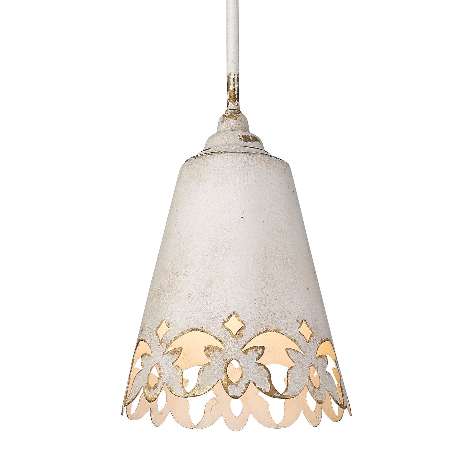 Enhance your space with the rustic elegance of Eloise. Hand-painted to mimic a treasure you would find in a French bazaar; the faded Antique Ivory finish adds to the vintage quality. Carved patterns in the fixture’s metal shade play with light and shadows creating a unique visual effect. The openings allow ambient light to spread through the room. Hang this beautiful mini pendant alone or hang in a group.