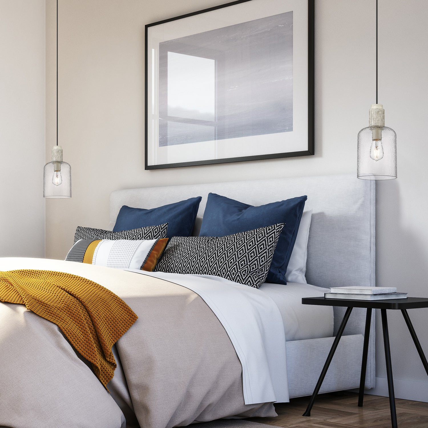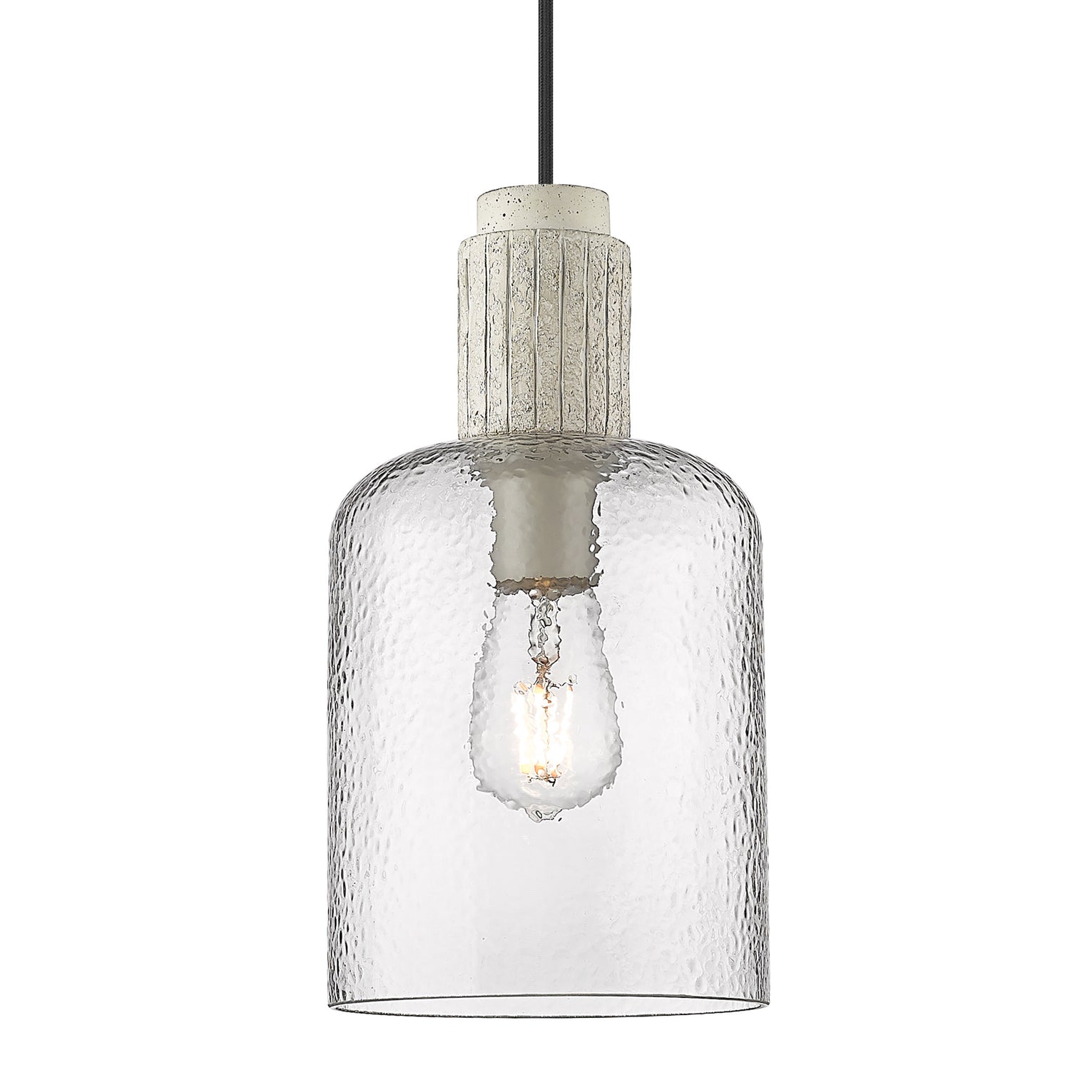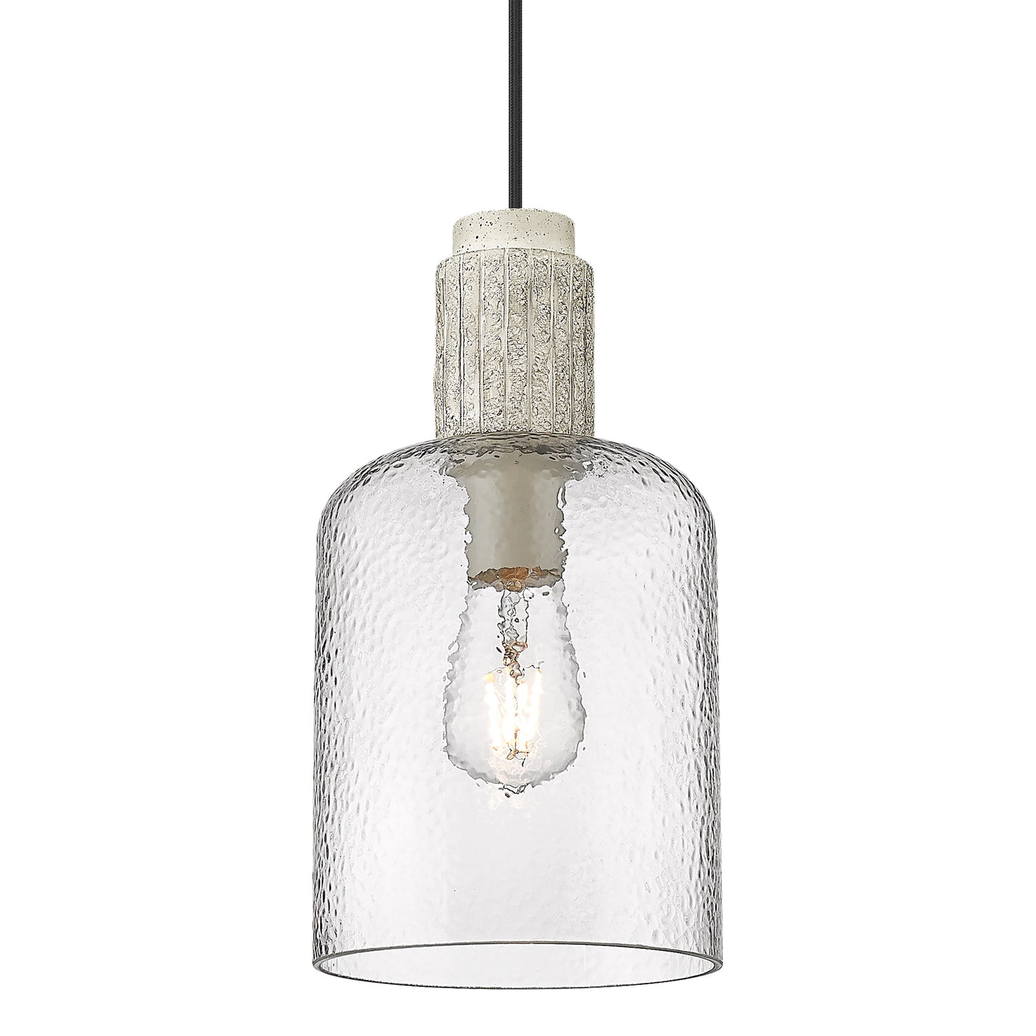 Pedra's simple silhouette creates a versatile look that is suitable for transitional spaces. Blending indoor and outdoor elements, Pedra uses textured glass and stone materials to create an interesting design that is ideal for eclectic interiors. The tone of the cement accent complements the Hammered Clear Glass shade. Matte Black hardware and a matching cable wire add modern touches. Hang this pendant alone or install multiples over a countertop.