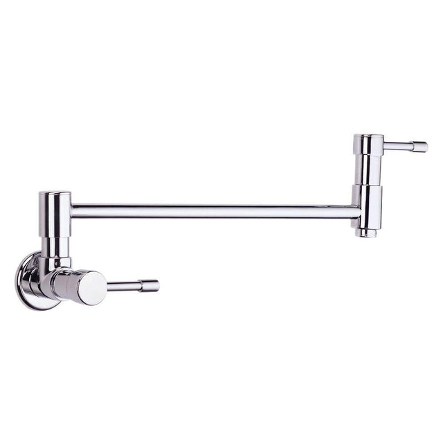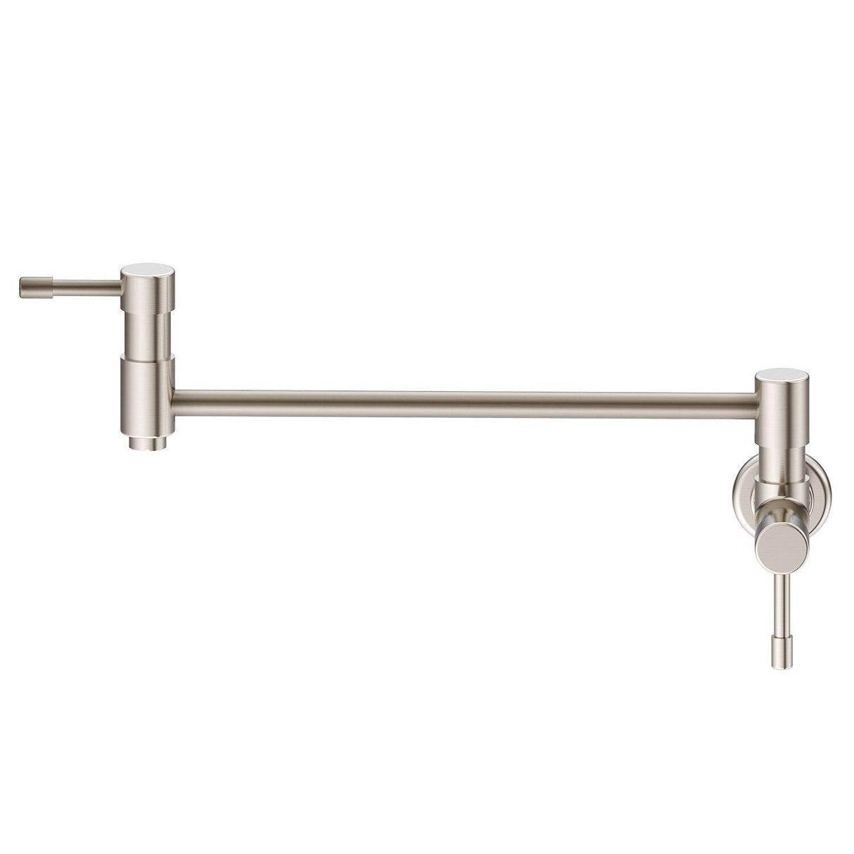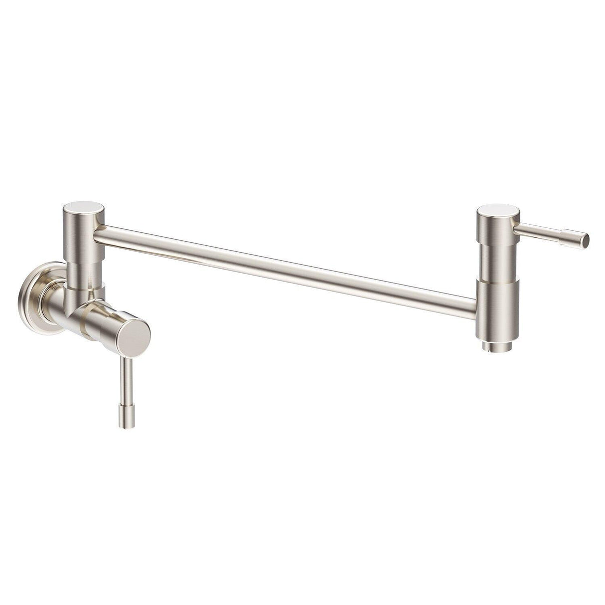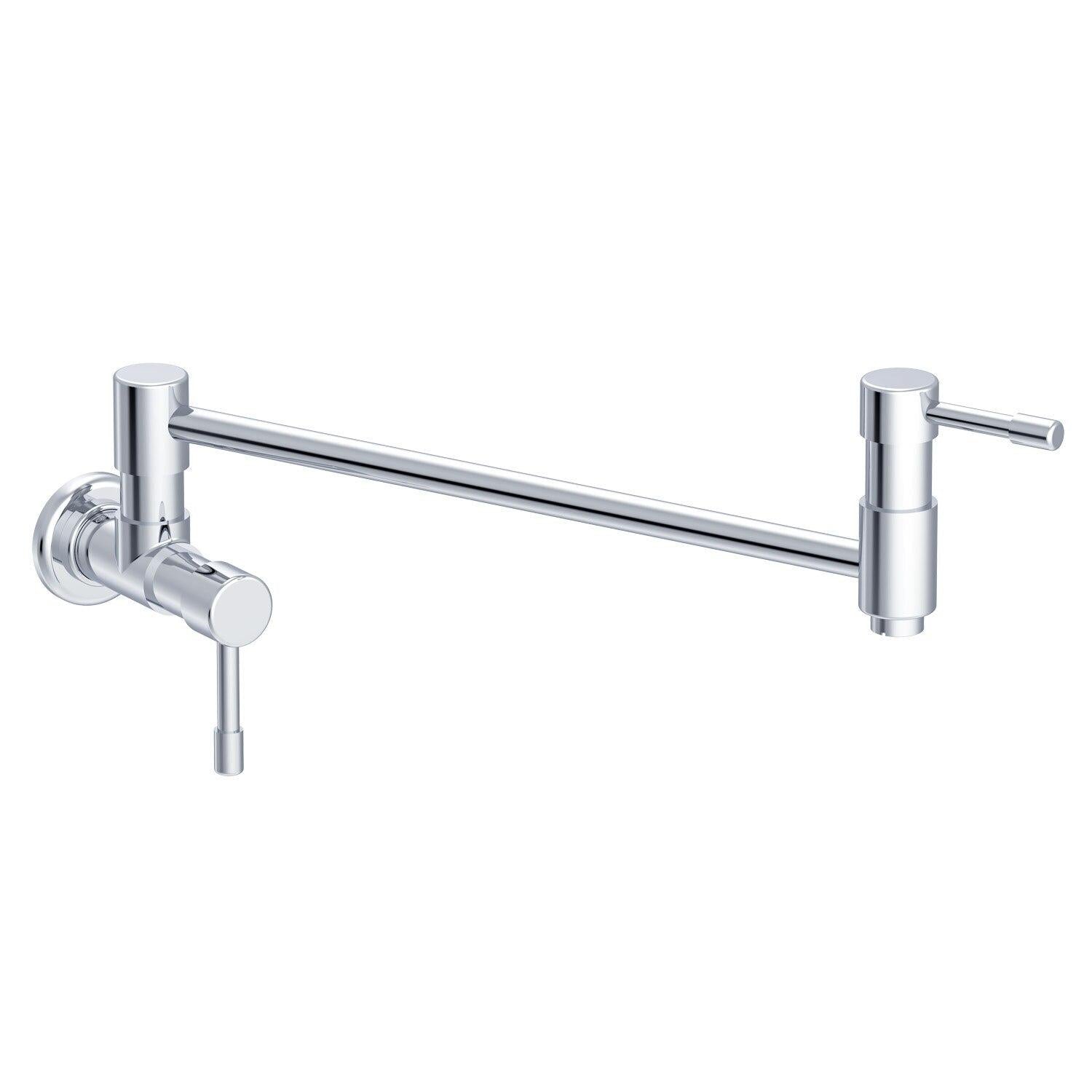 Product DescriptionThis pot filler can extend 15 inches, and offers dual handle operation for independent water control at the spout or the wall. With streamlined detailing, the Melrose Wall Mount Pot Filler is the ultimate kitchen helper from dinner prep to filling coffee pots. The single hole, wall-mount configuration can be installed above a stovetop or any counter space to add a convenient water source that quickly fills pots and vessels with a 2.2 gpm steady stream of water. ADA-compliant handles feature ceramic disc cartridges to provide drip-free performance and effortless operation. When not in use, the folding pot filler sits against the wall for a space-saving solution.From the ManufacturerFor nearly 20 years, the kitchen and bath industry has known Danze as a leader in product design and beautiful styling. What industry professionals and homeowners may not have known is that Danze has a sister company, Gerber - an 85-year-old manufacturer of some of the highest performing, most reliable products on the market. To best meet the diverse and ever-changing needs of home products, Danze has transformed to be Danze by Gerber, a perfect blend of the handcrafted, trusted performance of Gerber on the inside and beautiful design on the outside. The Danze by Gerber product combination can be found in a range of kitchen and bath faucets, bath accessories and shower systems. A thoughtful balance of form and function. Inspired, beautiful design on the outside. Handcrafted, trusted performance on the inside. A combination that results in true value and commitment. You can call it a breath of fresh air. We call it Danze by Gerber. Product Information Product Overview Connection Type: 1/2 -14npt ConnectionFlow Rate: 2.2gpm Max Flow Rate @ 60 psiInstallation: 1-Hole Wall-Mount InstallationBrand: Gerber Features Designed for Cold Water Supply OnlyCartridge Type: Includes Durable Ceramic Disc Valve for Drip-Free PerformanceSpout Swivel: 15 swivel spout features independent on/off and volume control valves and folds out of the way when not in useWarranty: Limited lifetime Description The Melrose Wall Mount Pot Filler is the ultimate kitchen companion. Extending to 15 inches this pot filler is available in chrome or stainless steel and brings convenience and style to your cooking space. With easy installation and durable ceramic disc valves enjoy drip-free performance and peace of mind with Gerber s limited lifetime warranty.
