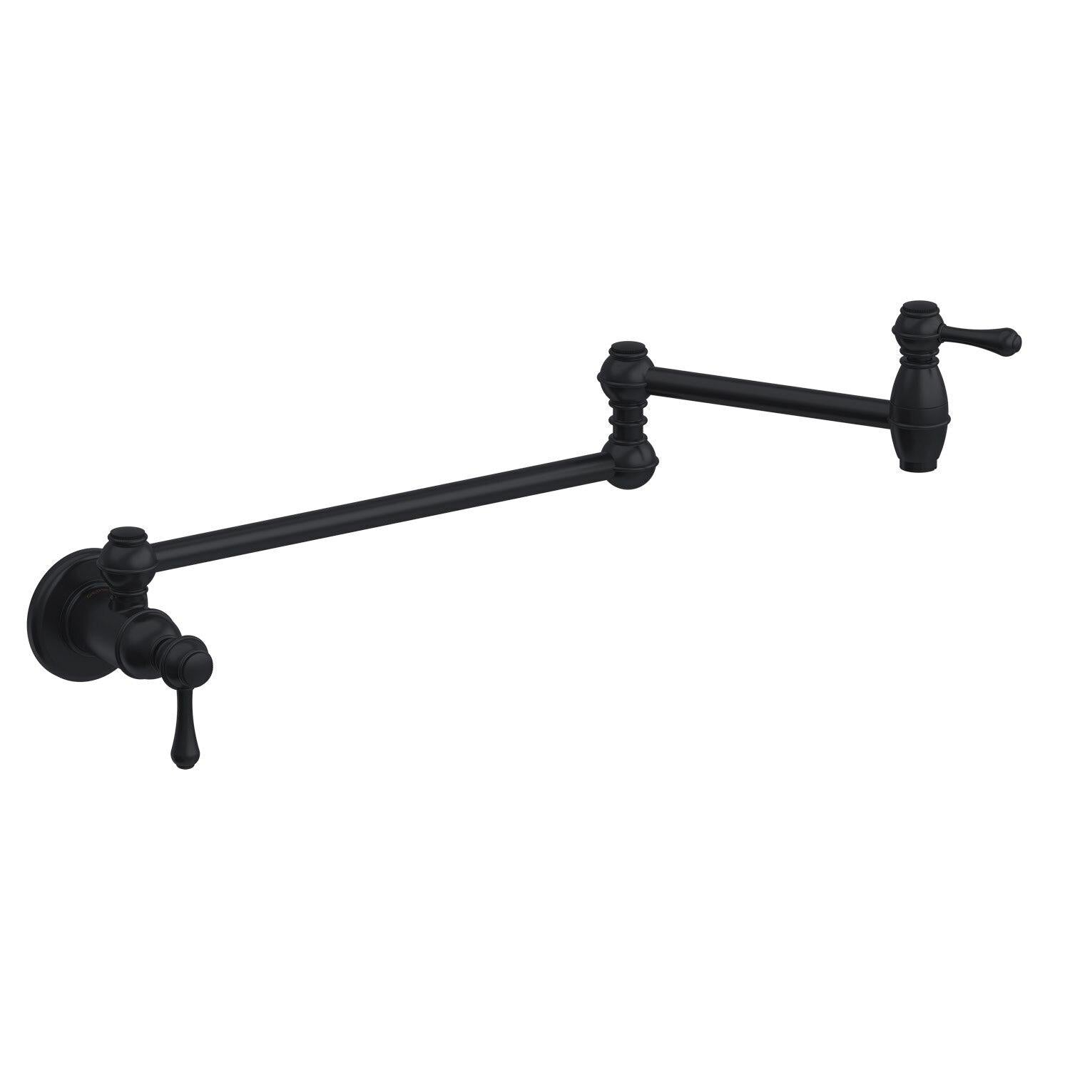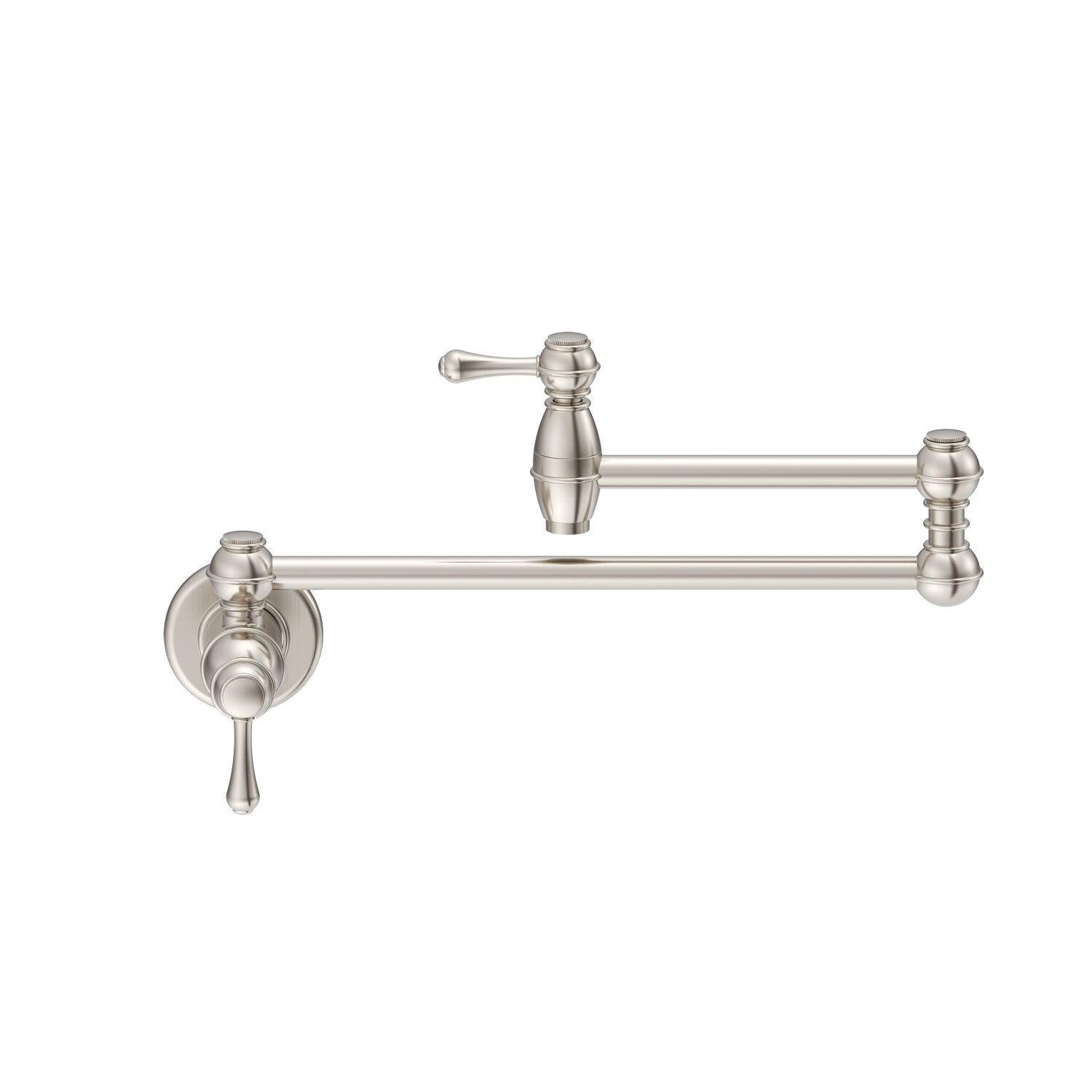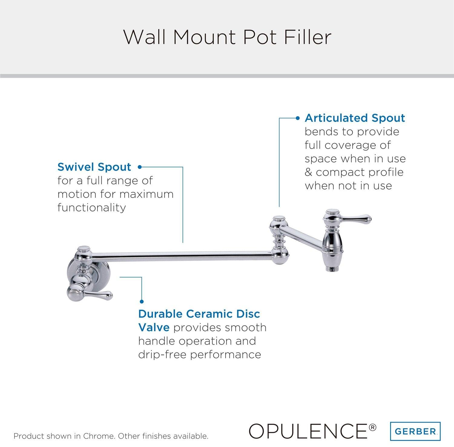 .comAvailable in six attractive finishes, the Danze Opulence Single-Handle Wall-Mount Pot Filler saves you time and effort by allowing you to fill a pot with water directly at or near the cooking area. This single-hole mount pot filler has a rich, elegant look that instantly updates your kitchen and complements both traditional and modern decor.Opulence Single-HandleWall-Mount Pot FillerAt a Glance: Stainless steel pot filler designed for cold-water hookupSaves excess strain on hands, wrists, and backTwo-piece articulated spout folds out of the waySpout reach extends up to 22 inchesLimited lifetime warrantyPractical and elegant, this wall-mount pot filler extends up to 22 inches. View larger.Available in Chrome, Antique Copper, Black Satin, Polished Brass, Oil Rubbed Bronze, and Stainless Steel finishes. View larger.Save Time and Spare Your Wrists and BackA hallmark of mass industrial kitchens, a pot filler is a great addition to your kitchen because it spares you the work of having to carry a pot back and forth to the sink. With the Danze Opulence Single-Handle Wall-Mount Pot Filler you can fill pots right at the cooktop, so you'll never again have to haul a heavy pot full of water from the sink to the stove. This prevents excessive strain on your hands, wrists, arms and back, while also saving you time.Extending Spout Works with Any Pot; Ceramic Valve for Drip-Free PerformanceDesigned to be used with a cold-water hookup, the Opulence Pot Filler installs on a 1/2-inch IPS/NPT-threaded stub out and features a classic design with a two-piece articulated spout that folds out of the way when not in use. Its spout reach extends up to 22 inches to suit any type of pot, while two ceramic disc valves ensure smooth turning and drip-free performance. Your choice of six attractive finishes--Chrome, Oil Rubbed Bronze, Black Satin, Stainless Steel, Antique Copper, and Polished Brass-- will suit any decor and provide long-term beauty and durability.Low-Lead Compliancy and Warranty InformationThe Opulence Pot Filler is compliant with low-lead requirements of California AB 1953 and Vermont Act 193, and is backed by a limited lifetime warranty.About DanzeDanze, Inc. is a manufacturer of premium shower heads, faucets, bathroom fixtures and bath accessories. Danze faucets were first available in 2001, and the product line rapidly developed to encompass over 1,500 decorative products. Its line of products includes 20 collections of faucets for the bath, over 100 faucets for the kitchen and entertainment areas, 10 collections of matching bath accessories, and an impressive range of spectacular brass shower products featuring over 130 styles of shower heads and unique shower arms. Danze products offer as standard such quality features as ceramic valves, heavy pattern brass construction, lead-free waterways meeting the requirements of the ANSI/NSF 61, and a wide variety of durable and decorative finishes.What's in the BoxDanze Opulence Single-Handle Wall-Mount Pot Filler, manual, and hardware.Product DescriptionNo gourmet’s kitchen is complete without the Opulence Wall Mount Pot Filler. The elegant 22” tap extends to fill any pot on your stove with a consistent stream of cool water. And, when you’re done crafting your next edible masterpiece, its two-piece articulated spout tucks tidily away until next needed. Bon Appétit!From the ManufacturerFor nearly 20 years, the kitchen and bath industry has known Danze as a leader in product design and beautiful styling. What industry professionals and homeowners may not have known is that Danze has a sister company, Gerber - an 85-year-old manufacturer of some of the highest performing, most reliable products on the market. To best meet the diverse and ever-changing needs of home products, Danze has transformed to be Danze by Gerber, a perfect blend of the handcrafted, trusted performance of Gerber on the inside and beautiful design on the outside. The Danze by Gerber Product Information Product Overview Connection Type: 1/2 -14npt ConnectionFlow Rate: 2.2gpm Max Flow Rate @ 60 psiInstallation: 1-Hole Wall-Mount InstallationBrand: Gerber Features Designed for Cold Water Supply OnlyCartridge Type: Includes Durable Ceramic Disc Valve for Drip-Free PerformanceSpout Swivel: 20 two-point articulating spout features independent on/off and volume control valves and folds out of the way when not in useWarranty: Limited lifetime Description Introducing the Opulence Wall Mount Pot Filler - the essential addition to your gourmet kitchen. This pot filler combines elegance and functionality to elevate your culinary experience.Designed for convenience the Opulence features a 20 two-point articulating spout with independent on/off and volume control valves. Its sleek and versatile design allows it to fold away when not in use maximizing space in your kitchen.Crafted with durability in mind this pot filler includes a durable ceramic disc valve for drip-free performance. With a 1/2 -14npt connection and a maximum flow rate of 2.2gpm at 60 psi it ensures a consistent and efficient stream of cool water.The Opulence Wall Mount Pot Filler is backed by Gerber s limited lifetime warranty guaranteeing its quality and protecting against manufacturing defects.Complete your gourmet kitchen with the Opulence Wall Mount Pot Filler. Experience the convenience and elegance of a pot filler over the stove. Choose from chrome satin black or stainless steel finishes and enhance your culinary masterpiece today.