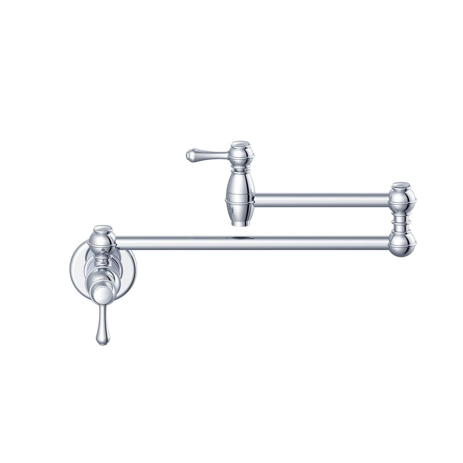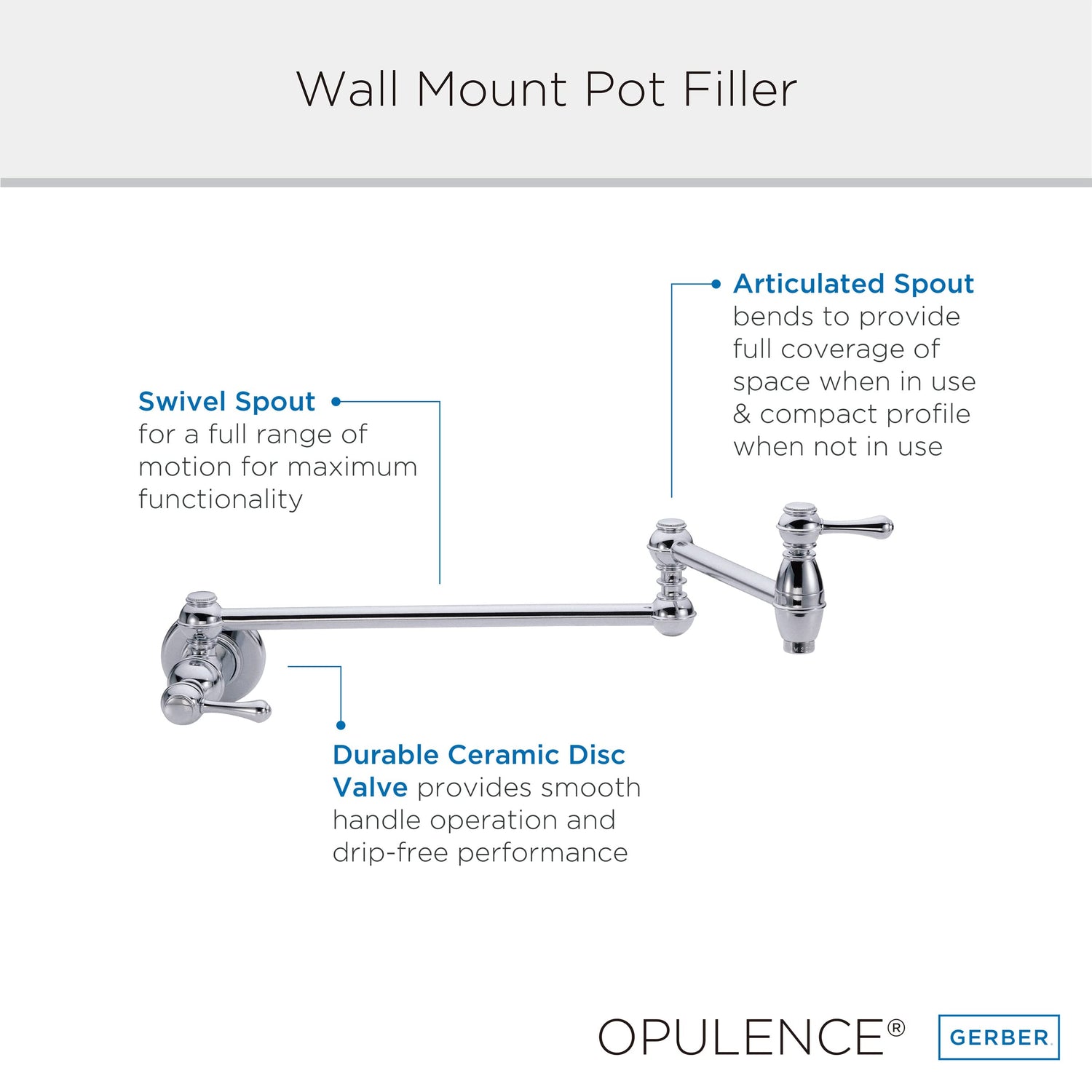 .comAvailable in six attractive finishes, the Danze Opulence Single-Handle Wall-Mount Pot Filler saves you time and effort by allowing you to fill a pot with water directly at or near the cooking area. This single-hole mount pot filler has a rich, elegant look that instantly updates your kitchen and complements both traditional and modern decor.Opulence Single-HandleWall-Mount Pot FillerAt a Glance: Stainless steel pot filler designed for cold-water hookupSaves excess strain on hands, wrists, and backTwo-piece articulated spout folds out of the waySpout reach extends up to 22 inchesLimited lifetime warrantyPractical and elegant, this wall-mount pot filler extends up to 22 inches. View larger.Available in Chrome, Antique Copper, Black Satin, Polished Brass, Oil Rubbed Bronze, and Stainless Steel finishes. View larger.Save Time and Spare Your Wrists and BackA hallmark of mass industrial kitchens, a pot filler is a great addition to your kitchen because it spares you the work of having to carry a pot back and forth to the sink. With the Danze Opulence Single-Handle Wall-Mount Pot Filler you can fill pots right at the cooktop, so you'll never again have to haul a heavy pot full of water from the sink to the stove. This prevents excessive strain on your hands, wrists, arms and back, while also saving you time.Extending Spout Works with Any Pot; Ceramic Valve for Drip-Free PerformanceDesigned to be used with a cold-water hookup, the Opulence Pot Filler installs on a 1/2-inch IPS/NPT-threaded stub out and features a classic design with a two-piece articulated spout that folds out of the way when not in use. Its spout reach extends up to 22 inches to suit any type of pot, while two ceramic disc valves ensure smooth turning and drip-free performance. Your choice of six attractive finishes--Chrome, Oil Rubbed Bronze, Black Satin, Stainless Steel, Antique Copper, and Polished Brass-- will suit any decor and provide long-term beauty and durability.Low-Lead Compliancy and Warranty InformationThe Opulence Pot Filler is compliant with low-lead requirements of California AB 1953 and Vermont Act 193, and is backed by a limited lifetime warranty.About DanzeDanze, Inc. is a manufacturer of premium shower heads, faucets, bathroom fixtures and bath accessories. Danze faucets were first available in 2001, and the product line rapidly developed to encompass over 1,500 decorative products. Its line of products includes 20 collections of faucets for the bath, over 100 faucets for the kitchen and entertainment areas, 10 collections of matching bath accessories, and an impressive range of spectacular brass shower products featuring over 130 styles of shower heads and unique shower arms. Danze products offer as standard such quality features as ceramic valves, heavy pattern brass construction, lead-free waterways meeting the requirements of the ANSI/NSF 61, and a wide variety of durable and decorative finishes.What's in the BoxDanze Opulence Single-Handle Wall-Mount Pot Filler, manual, and hardware.Product DescriptionNo gourmet’s kitchen is complete without the Opulence Wall Mount Pot Filler. The elegant 22” tap extends to fill any pot on your stove with a consistent stream of cool water. And, when you’re done crafting your next edible masterpiece, its two-piece articulated spout tucks tidily away until next needed. Bon Appétit!From the ManufacturerFor nearly 20 years, the kitchen and bath industry has known Danze as a leader in product design and beautiful styling. What industry professionals and homeowners may not have known is that Danze has a sister company, Gerber - an 85-year-old manufacturer of some of the highest performing, most reliable products on the market. To best meet the diverse and ever-changing needs of home products, Danze has transformed to be Danze by Gerber, a perfect blend of the handcrafted, trusted performance of Gerber on the inside and beautiful design on the outside. The Danze by Gerber Product Information Product Overview Connection Type: 1/2 -14npt ConnectionFlow Rate: 2.2gpm Max Flow Rate @ 60 psiInstallation: 1-Hole Wall-Mount InstallationBrand: Gerber Features Designed for Cold Water Supply OnlyCartridge Type: Includes Durable Ceramic Disc Valve for Drip-Free PerformanceSpout Swivel: 20 two-point articulating spout features independent on/off and volume control valves and folds out of the way when not in useWarranty: Limited lifetime Description Introducing the Opulence Wall Mount Pot Filler - the essential addition to your gourmet kitchen. This pot filler combines elegance and functionality to elevate your culinary experience.Designed for convenience the Opulence features a 20 two-point articulating spout with independent on/off and volume control valves. Its sleek and versatile design allows it to fold away when not in use maximizing space in your kitchen.Crafted with durability in mind this pot filler includes a durable ceramic disc valve for drip-free performance. With a 1/2 -14npt connection and a maximum flow rate of 2.2gpm at 60 psi it ensures a consistent and efficient stream of cool water.The Opulence Wall Mount Pot Filler is backed by Gerber s limited lifetime warranty guaranteeing its quality and protecting against manufacturing defects.Complete your gourmet kitchen with the Opulence Wall Mount Pot Filler. Experience the convenience and elegance of a pot filler over the stove. Choose from chrome satin black or stainless steel finishes and enhance your culinary masterpiece today.