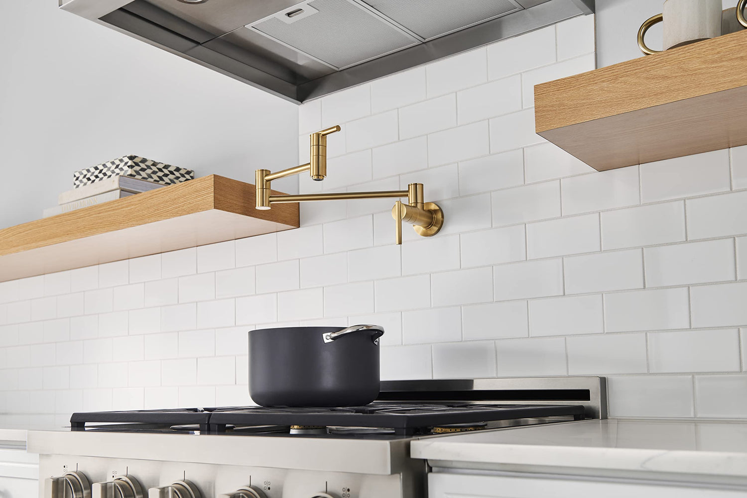 With a 22" reach and dual handle controls, the Parma Wall Mount Pot Filler is any cooking enthusiast's dream. Offering a smooth, minimalist spout style, this versatile pot filler features a two-point articulating spout, providing convenience and flexibility to reach any vessel within its filling radius. The single hole, wall-mount configuration can be installed above a stovetop or any counter space to add a convenient water source that quickly fills your pots with a 2.2 gpm steady stream of water. Faucet's ADA-compliant handles provide ease of use. This folding pot filler's sits neatly against the backsplash when not in use. Featuring durable construction, upgrade your kitchen with the Parma Pot Filler today and experience the perfect blend of style and functionality. Product Information Product Overview Connection Type: 1/2 -14npt ConnectionFlow Rate: 2.2gpm Max Flow Rate @ 60 psiInstallation: 1-Hole Wall-Mount InstallationBrand: Gerber Features Designed for Cold Water Supply OnlyCartridge Type: Includes Durable Ceramic Disc Valve for Drip-Free PerformanceSpout Swivel: 20 two-point articulating spout features independent on/off and volume control valves and folds out of the way when not in useWarranty: Limited lifetime Description The Parma Single Handle Wall Mount Pot Filler is any cooking enthusiast s dream. This versatile pot filler features a 20 two-point articulating spout providing convenience and flexibility. Easily fill your pots right on the stove with its cool steady stream of water. Its sleek design and durable construction make it a must-have for cooking enthusiasts. Upgrade your kitchen with the Parma Pot Filler today and experience the perfect blend of style and functionality.
