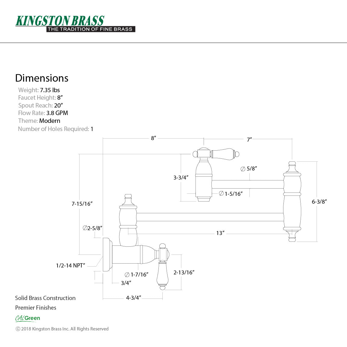 • 3.8 GPM/14.4 LPM spout flow rate at 60 PSI