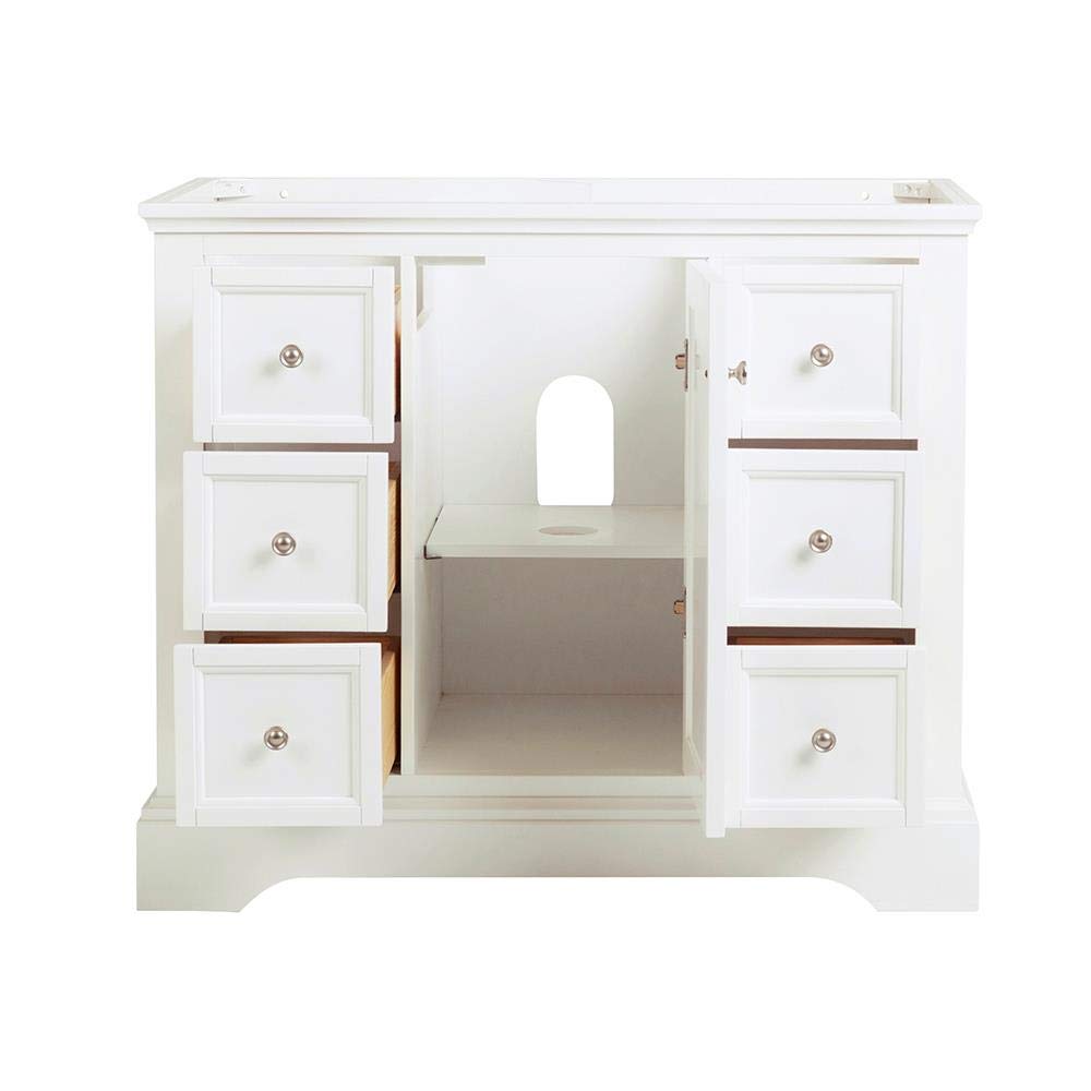 With its sophisticated textured White finish, the Windsor Traditional Freestanding Bathroom Cabinet features top-to-bottom details that elevate its beauty; Cavetto crown molding graces the top, while the toe kick with elegant stacked base molding adds the perfect finishing touch. The shaker-style flat panel door at the center, opens to reveal a roomy compartment for organizing products of varying sizes, with a lower shelf thats ideal for hand towels. Spacious, soft closing drawers down both sides provide ample storage space for all of your bathroom essentials. The dovetail drawers are solid pine with a clear coat finish. The soft-close drawers and door feature distinctive brushed nickel pulls. This lovely cabinet will enhance any décor and is available in multiple sizes and finishes. It includes installation hardware.